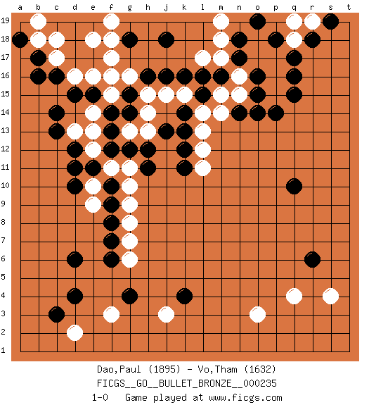 Last move : 1-0 2020 February 11 22:4:42 [Event "FICGS__GO__BULLET_BRONZE__000235 "] [Site "FICGS"] [Date "2020.02.11"] [Round "1"] [Black "Dao,Paul "] [White "Vo,Tham "] [Result "1-0"] [Rating 1 "1895"] [Rating 2 "1632"] 1.q16 q4 2.d4 d16 3.r6 o3 4.q10 s4 5.c14 f17 6.d10 f3 7.d6 d2 8.c3 j3 9.b16 c17 10.d12 o17 11.o16 n16 12.o15 n15 13.n14 m14 14.o14 p17 15.q17 p16 16.q15 p15 17.p14 q18 18.r18 q19 19.n17 m17 20.n18 m18 21.p18 o18 22.o19 m19 23.l15 m15 24.l16 l17 25.m16 l14 26.k14 l13 27.k13 l12 28.k12 l11 29.k11 k15 30.k16 j15 31.j16 h15 32.h16 g16 33.g15 h14 34.j18 f15 35.g14 g13 36.f14 e14 37.f13 e13 38.f12 e12 39.e11 f11 40.g12 h13 41.h12 e10 42.d11 e9 43.f10 g11 44.h11 g10 45.f9 g9 46.f8 g8 47.f7 g7 48.f6 g6 49.b17 b18 50.a18 c18 51.e15 f16 52.d15 e16 53.g18 f18 54.c16 d13 55.c13 r19 56.s19 f19 57.j13 b19 58.k4 e18 59.g4 1-0 Here are the names of the openings (joseki) played in the four corners : Corner q4 : q4 r6Hoshi (Hwajeom, Seongjeom, Xingwei`) 4-4 Point. The star or hoshi (4-4) point, emphasizing influence at the potential expense of territory.Ikken Kakari (Hankan Keolch'im, Yi Gua`jiao~, 1-Space Low Approach). Black 2 is the standard approach move to the 4-4. Corner d16 : d16 c14Hoshi (Hwajeom, Seongjeom, Xingwei`) 4-4 Point. The star or hoshi (4-4) point, emphasizing influence at the potential expense of territory.Ikken Kakari (Hankan Keolch'im, Yi Gua`jiao~, 1-Space Low Approach). Black 2 is the standard approach move to the 4-4. Corner d4 : d4 f3Hoshi (Hwajeom, Seongjeom, Xingwei`) 4-4 Point. The star or hoshi (4-4) point, emphasizing influence at the potential expense of territory.Ikken Kakari (Hankan Keolch'im, Yi Gua`jiao~, 1-Space Low Approach). White 2 is the standard approach move to the 4-4. Corner q16 : q16 o17Hoshi (Hwajeom, Seongjeom, Xingwei`) 4-4 Point. The star or hoshi (4-4) point, emphasizing influence at the potential expense of territory.Ikken Kakari (Hankan Keolch'im, Yi Gua`jiao~, 1-Space Low Approach). White 2 is the standard approach move to the 4-4. Player Black won this Go (weiqi, baduk) game.Follow this game move after move (download ) The simplest move is the best move. (Anonymous) Have no fear of perfection - you'll never reach it. (Salvador Dali)