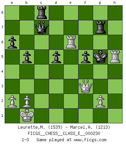 Last move : 1-0 2020 March 10 13:28:3 [Event "FICGS__CHESS__CLASS_E__000230"] [Site "FICGS"] [Date "2020.02.14"] [Round "1"] [White "Leurette,Marc-Antoine"] [Black "Marcel,Alexis"] [Result "1-0"] [WhiteElo "1539"] [BlackElo "1213"] 1.e4 g6 2.d4 Bg7 3.Nf3 c5 4.c3 cxd4 5.cxd4 e6 6.Nc3 Ne7 7.Bf4 O-O 8.e5 Nbc6 9.Qd2 a6 10.h4 b5 11.h5 Bb7 12.hxg6 fxg6 13.Bh6 Bxh6 14.Qxh6 Rf7 15.Ng5 Rg7 16.Nxh7 Nf5 17.Nf6+ Kf7 18.Qd2 Ncxd4 19.Nce4 Bxe4 20.Nxe4 Qc7 21.Bd3 Qxe5 22.O-O-O d5 23.Ng5+ Kf6 24.Rhe1 Qc7+ 25.Kb1 Nh4 26.f4 Rc8 27.Qf2 Nhf5 28.Bxf5 gxf5 29.Qxd4+ Kg6 30.Rxe6+ Kh5 31.Rh1+ Kg4 32.Qd1+ Kxf4 33.Qf3+ Kxg5 34.Rh5+ 1-0 Robatsch (Modern) defense Kingside Castling by player Black (move 7) Queenside Castling by player White (move 22) Player White won this chess game. Follow this game move after move (download)If one piece is badly posted, the whole game is bad. (Tarrasch) Frage: Was machen Sie mit den Preisen? Anwort: Ich habe Angst, dass meine Freundin davon neue Kleider kauft. (Loek van Wely) Después de una mala apertura, hay una esperanza en el juego medio. Pero una vez que estas en finales, el momento de la verdad ha llegado. (Edmar Mednis) Vouloir jouer aux échecs contre soi-même est aussi paradoxal que vouloir marcher sur son ombre. (Stefan Zweig) Be who you are, and say what you feel because those who mind don't matter, and those who matter don't mind. (Dr Seuss)