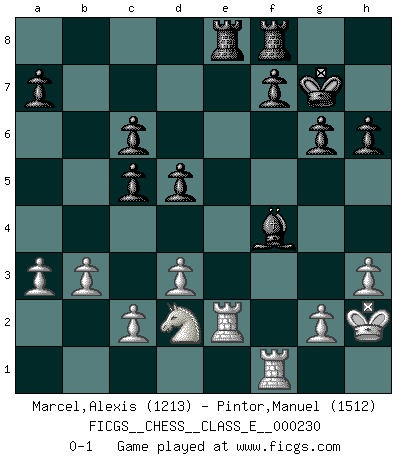 Last move : 0-1 2020 March 3 13:38:15 [Event "FICGS__CHESS__CLASS_E__000230"] [Site "FICGS"] [Date "2020.02.14"] [Round "1"] [White "Marcel,Alexis"] [Black "Pintor,Manuel"] [Result "0-1"] [WhiteElo "1213"] [BlackElo "1512"] 1.f4 Nc6 2.Nf3 d5 3.e3 Bf5 4.b3 Nf6 5.Be2 Nb4 6.d3 e6 7.Bb2 Be7 8.O-O O-O 9.Nbd2 c5 10.a3 Nc6 11.Ne5 Nd7 12.Nxc6 bxc6 13.Bg4 Bxg4 14.Qxg4 Nf6 15.Qf3 h6 16.h3 Nh7 17.f5 exf5 18.Qxf5 Ng5 19.Rf2 Qc7 20.Be5 Qc8 21.Raf1 Qxf5 22.Rxf5 g6 23.R5f2 Rae8 24.Bf4 Kg7 25.Bxg5 Bxg5 26.Kh2 Bxe3 27.Re2 Bf4+ 0-1 Bird's Opening Kingside Castling by player White (move 8) Kingside Castling by player Black (move 8) Player Black won this chess game. Follow this game move after move (download)All my games are real. (Bobby Fischer) Heutzutage gewinnt im Turnier nicht derjenige Spieler, der weitreichende Pläne entwirft, sondern einfach jener, der Zug um Zug kämpft. (David Bronstein) Si no le temes a Spassky, entonces elimino el elemento del dinero. (Jim Slater) Les échecs, c'est l'imagination. (David Bronstein) Internal peace cannot coexist with external war. (Don Groves)