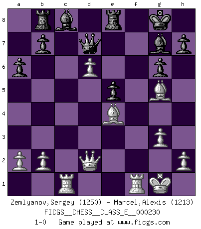 Last move : 1-0 2020 May 23 12:24:50 [Event "FICGS__CHESS__CLASS_E__000230"] [Site "FICGS"] [Date "2020.02.14"] [Round "1"] [White "Zemlyanov,Sergey"] [Black "Marcel,Alexis"] [Result "1-0"] [WhiteElo "1250"] [BlackElo "1213"] 1.d4 f5 2.g3 Nf6 3.Bg2 g6 4.Nf3 Bg7 5.O-O O-O 6.c4 d6 7.Nc3 a6 8.Bg5 Re8 9.Qd2 Nc6 10.d5 Ne5 11.Nxe5 dxe5 12.c5 e4 13.f3 exf3 14.Bxf3 e5 15.e4 fxe4 16.Nxe4 Nxe4 17.Bxe4 Qd7 18.d6 cxd6 19.cxd6 Rb8 20.Rac1 1-0 Dutch defense Kingside Castling by player White (move 5) Kingside Castling by player Black (move 5) Player White won this chess game. Follow this game move after move (download)Up to this point White has been following well-known analysis. But now he makes a fatal error: he begins to use his own head. (Siegbert Tarrasch) Wenn ein Kopf und ein Buch zusammenstoßen und es klingt hohl, ist es denn allemal im Buche? (Georg Christoph Lichtenberg) Hay jugadores fuertes y personas amables y yo soy un jugador fuerte. (Bobby Fischer) Votre prénom est 'Tactique', votre deuxième prénom est 'Tactique' et votre nom est 'Tactique'. (Ken Smith) To send light into the darkness of men's hearts - such is the duty of the artist. (Schumann)