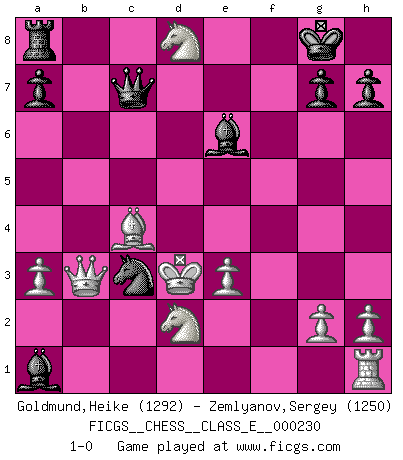 Last move : 1-0 2020 May 23 12:24:50 [Event "FICGS__CHESS__CLASS_E__000230"] [Site "FICGS"] [Date "2020.02.14"] [Round "1"] [White "Goldmund,Heike"] [Black "Zemlyanov,Sergey"] [Result "1-0"] [WhiteElo "1292"] [BlackElo "1250"] 1.b4 e5 2.Bb2 Bxb4 3.Bxe5 Nf6 4.a3 Be7 5.c4 O-O 6.Nf3 d5 7.cxd5 Nxd5 8.Qb3 Nc6 9.e3 Nxe5 10.Nxe5 Bf6 11.d4 c5 12.Bc4 cxd4 13.Nxf7 Qa5+ 14.Nd2 dxe3 15.fxe3 Be6 16.Nd6 Bxa1 17.Nxb7 Qc7 18.Ke2 Nc3+ 19.Kd3 Rfd8+ 20.Nxd8 1-0 This chess game has been lost on time (started : 2020.02.14 11:10:46) Polish (Sokolsky) opening Kingside Castling by player Black (move 5) Player White won this chess game. Follow this game move after move (download)What would Chess be without silly mistakes ? (Kurt Richter) Ich brauche nur einen Blick auf das Schachbrett zu werfen, und weiß schon, was in der Stellung steckt, was geschehen kann und was geschehen wird. Alle übrigen suchen und prüfen, ich aber weiß es! (José Raúl Capablanca) Morphy probablemente fue el genio más grande de todos. (Bobby Fischer) Vous n'êtes pas toujours obligé de jouer le meilleur coup. Un coup doit être actif, entreprenant, correct et beau ! (David Bronstein) For to win one hundred victories in one hundred battles is not the acme of skill. To subdue the enemy without fighting is the acme of skill. (Sun Tzu)