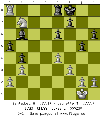 Last move : 0-1 2020 March 27 0:40:13 [Event "FICGS__CHESS__CLASS_E__000230"] [Site "FICGS"] [Date "2020.02.14"] [Round "1"] [White "Piantadosi,Angelo"] [Black "Leurette,Marc-Antoine"] [Result "0-1"] [WhiteElo "1391"] [BlackElo "1539"] 1.d4 d5 2.c4 e6 3.Nc3 Nf6 4.Bg5 Be7 5.e3 O-O 6.Nf3 h6 7.Bh4 b6 8.Bd3 Bb7 9.O-O dxc4 10.Bxc4 a6 11.Rc1 b5 12.Bb3 c5 13.dxc5 Nbd7 14.Bg3 Nxc5 15.Bc2 b4 16.Na4 Nce4 17.Bxe4 Bxe4 18.Ne5 Qxd1 19.Rfxd1 Rad8 20.Rxd8 Bxd8 21.f3 Bd5 22.b3 a5 23.Nc6 Bxc6 24.Rxc6 Nd5 25.e4 Ne7 26.Ra6 g5 27.Bd6 Re8 28.Bxe7 Rxe7 29.Ra8 Re8 30.Nc5 Kf8 31.Nb7 Bb6+ 0-1 QGD : Tartakower (Makagonov-Bondarevsky) system Kingside Castling by player Black (move 5) Kingside Castling by player White (move 9) Player Black won this chess game. Follow this game move after move (download)Chess is ruthless: you've got to be prepared to kill people. (Nigel Short) Der beste Spieler in einem Turnier gewinnt es nie. Er landet auf Platz zwei oder drei. (Siegbert Tarrasch) Coloca el contenido de las piezas del Ajedrez en un sombrero, agitalo vigorosamente, arrojalas en un tablero desde una altura de 30 centimetros y así obtendras el estilo de Steinitz. (H. E. Bird) Le moment que je préfère le plus dans une rencontre, c'est celui où je sens que la personnalité de l'adversaire se brise. (Robert Fischer) I would love to change the world, but they won't give me the source code. (Unknown)