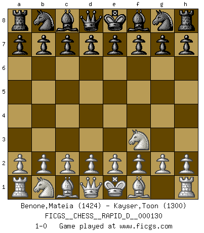 Last move : 1-0 2020 March 16 12:22:42 [Event "FICGS__CHESS__RAPID_D__000130"] [Site "FICGS"] [Date "2020.02.15"] [Round "1"] [White "Benone,Mateia"] [Black "Kayser,Toon"] [Result "1-0"] [WhiteElo "1424"] [BlackElo "1300"] 1.Nf3 1-0 This chess game has been lost on time (started : 2020.02.15 11:24:19) Reti Opening Player White won this chess game. Follow this game move after move (download)A man without frontiers. He didn't divide the East and the West, he brought them together in their admiration for him. (Ljubomir Ljubojevic, about Bobby Fischer's death) Ich bin es gewohnt, das die Jugend mir überhaupt keinen Respekt entgegenbringt. (Alexander Morozewich) Dejen al perfeccionista jugar por correo. (Yasser Seirawan) On entre au jeu d'Echecs comme on entre en Religion. Pour le joueur d'Echecs, la partie d'Echecs c'est l'office, la messe, le défilé du 1er Mai, le dépôt de gerbe au Monument aux Morts. C'est un drame sacré. (Michel Roos) The problem with troubleshooting is that trouble shoots back. (Anonymous)