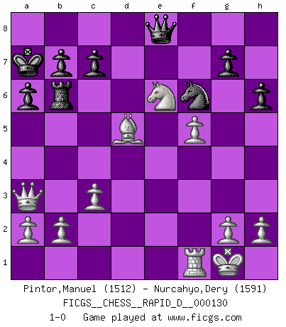Last move : 1-0 2020 April 29 16:3:56 [Event "FICGS__CHESS__RAPID_D__000130"] [Site "FICGS"] [Date "2020.02.15"] [Round "1"] [White "Pintor,Manuel"] [Black "Nurcahyo,Dery"] [Result "1-0"] [WhiteElo "1512"] [BlackElo "1591"] 1.e4 e5 2.f4 d6 3.Nf3 Nc6 4.Bb5 Bd7 5.O-O a6 6.Bc4 h6 7.d4 exd4 8.Nxd4 Qf6 9.e5 Qg6 10.e6 fxe6 11.Nxe6 Bxe6 12.Bxe6 Nf6 13.f5 Qh7 14.Qe2 Be7 15.c3 Ne5 16.Bf4 Ned7 17.Qc4 O-O-O 18.Nd2 Kb8 19.Nb3 Nb6 20.Qb4 Nfd5 21.Qe4 Nf6 22.Qe2 d5 23.Qf2 Ne4 24.Qxb6 Bd6 25.Bxd6 Rxd6 26.Qb4 Rb6 27.Qe7 Nf6 28.Rae1 Re8 29.Qf7 Qh8 30.Re2 Rf8 31.Qe7 Re8 32.Qa3 Ka7 33.Nd4 Ne4 34.Bxd5 Nf6 35.Rxe8 Qxe8 36.Ne6 1-0 This chess game has been lost on time (started : 2020.02.15 11:24:19) King's gambit Kingside Castling by player White (move 5) Queenside Castling by player Black (move 17) Player White won this chess game. Follow this game move after move (download)A strong memory, concentration, imagination, and a strong will is required to become a great Chess player. (Bobby Fischer) Frage: Was machen Sie mit den Preisen? Anwort: Ich habe Angst, dass meine Freundin davon neue Kleider kauft. (Loek van Wely) Solo existe una cosa que Fischer hace en el Ajedrez sin placer: ¡perder!. (Boris Spassky) La conception d'un plan est le processus par lequel un joueur exploite les avantages de sa position tout en s'efforçant d'en réduire au minimum les inconvénients. Afin de garantir le succès, un plan doit toujours se fonder sur un diagnostic objectif des particularités d'une position. La conception d'un plan est d'autant plus difficile que la position est équilibrée, et grandement facilitée lorsqu'il n'existe qu'un seul plan susceptible de répondre aux exigences de la position. (Harry Golombek) In God we trust, all others we virus scan. (Anonymous)