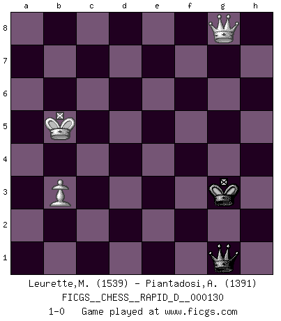 Last move : 1-0 2020 April 30 1:13:17 [Event "FICGS__CHESS__RAPID_D__000130"] [Site "FICGS"] [Date "2020.02.15"] [Round "1"] [White "Leurette,Marc-Antoine"] [Black "Piantadosi,Angelo"] [Result "1-0"] [WhiteElo "1539"] [BlackElo "1391"] 1.e4 e6 2.d4 d5 3.e5 c5 4.Nf3 cxd4 5.Nxd4 Bd7 6.Nc3 Bb4 7.Bd2 Nc6 8.Nxc6 Bxc6 9.Qg4 Bf8 10.Bd3 Ne7 11.O-O Ng6 12.Rfe1 Be7 13.Bxg6 hxg6 14.Ne2 Qc7 15.Nd4 O-O-O 16.Bg5 Bxg5 17.Qxg5 Rh5 18.Qg3 Rdh8 19.h3 Qb6 20.Qc3 Kd7 21.Red1 g5 22.Rd3 g4 23.Re1 gxh3 24.Rxh3 Rxh3 25.gxh3 Rh4 26.Rd1 Qc7 27.Qe3 Re4 28.Qf3 Ke7 29.Qa3+ Ke8 30.Qxa7 Kd7 31.Nf3 Rf4 32.Qe3 Rf5 33.Rd3 Rh5 34.Kh2 f6 35.Ng1 Rxe5 36.Qg3 Rg5 37.Qxc7+ Kxc7 38.Rg3 Rxg3 39.fxg3 e5 40.Kg2 d4 41.Kf2 Kd6 42.Ke2 e4 43.Kd2 f5 44.Ne2 Ke5 45.h4 Bd5 46.b3 b5 47.a3 d3 48.Nc3 Bc6 49.cxd3 exd3 50.Kxd3 f4 51.gxf4+ Kxf4 52.Kd4 Kg4 53.Kc5 Be8 54.Nxb5 Bxb5 55.Kxb5 Kxh4 56.a4 g5 57.a5 g4 58.a6 g3 59.a7 g2 60.a8Q g1Q 61.Qh8+ Kg3 62.Qg8+ 1-0 French : Advance, Nimzovich system Kingside Castling by player White (move 11) Queenside Castling by player Black (move 15) 10 pieces endgame at move 51 : White KNPPPP , Black KBPP WHITE : King + 1 Knight 4 Pawns BLACK : King + 1 Bishop 2 Pawns 9 pieces endgame at move 51 : White KNPPP , Black KBPP WHITE : King + 1 Knight 3 Pawns BLACK : King + 1 Bishop 2 Pawns 8 pieces endgame at move 54 : White KNPPP , Black KBP WHITE : King + 1 Knight 3 Pawns BLACK : King + 1 Bishop 1 Pawn 7 pieces endgame at move 54 : White KPPP , Black KBP WHITE : King + 3 Pawns BLACK : King + 1 Bishop 1 Pawn 6 pieces endgame at move 55 : White KPPP , Black KP WHITE : King + 3 Pawns BLACK : King + 1 Pawn 5 pieces endgame at move 55 : White KPP , Black KP WHITE : King + 2 Pawns BLACK : King + 1 Pawn Promotion Queen by player White (move 60) Promotion Queen by player Black (move 60) Player White won this chess game. Follow this game move after move (download)Nothing excites jaded Grandmasters more than a theoretical novelty. (Dominic Lawson) Schach ist das schnellste Spiel der Welt, weil man in jeder Sekunde Tausende von Gedanken ordnen muß. (Albert Einstein) Solo puedes ser bueno en el Ajedrez si amas al juego. (Bobby Fischer) La vie et les Echecs sont tous les deux une lutte constante. (Lasker) Information on the Internet is subject to the same rules and regulations as conversation at a bar. (George Lundberg)