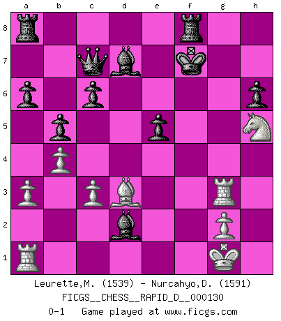 Last move : 0-1 2020 April 1 17:33:41 [Event "FICGS__CHESS__RAPID_D__000130"] [Site "FICGS"] [Date "2020.02.15"] [Round "1"] [White "Leurette,Marc-Antoine"] [Black "Nurcahyo,Dery"] [Result "0-1"] [WhiteElo "1539"] [BlackElo "1591"] 1.e4 e5 2.Nf3 d6 3.d4 exd4 4.Nxd4 Nf6 5.Nc3 c6 6.h3 h6 7.Bd3 Nbd7 8.O-O Ne5 9.f4 Ng6 10.Be3 Be7 11.f5 Ne5 12.Nf3 Bd7 13.Bd4 Nxf3+ 14.Rxf3 Qc7 15.a3 a6 16.b4 b5 17.Ne2 O-O 18.Ng3 Rfe8 19.c3 Nh7 20.Nh5 g6 21.fxg6 fxg6 22.Rg3 g5 23.h4 Rf8 24.hxg5 Nxg5 25.Be3 Kf7 26.Bxg5 Bxg5 27.e5 dxe5 28.Qd2 Bxd2 0-1 Philidor : Exchange variation Kingside Castling by player White (move 8) Kingside Castling by player Black (move 17) Player Black won this chess game. Follow this game move after move (download)Discovered check is the dive bomber of the Chessboard. (Reuben Fine) Ich erzeugte keinen Neid, da mich die Schachspieler als Musiker und die Musiker als Schachspieler betrachteten. (Mark Taimanov) A la fecha, Fischer esta simplemente un nivel arriba de todos los mejores jugadores de Ajedrez del mundo. (John Jacobs) Lorsque vous vous retrouvez devant une position atroce, ne tendez pas un ultime piège dérisoire avec l'intention d'abandonner si l'adversaire le déjoue ! Faites-vous plutôt un devoir de résister comme si votre vie en dépendait. Jouez le coup qui vous déplairait au centuple si vous étiez dans la peau de votre tortionnaire ! Luck is when opportunity knocks and you answer. (Anonymous)