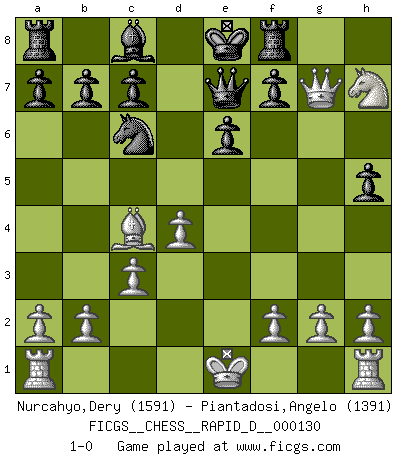 Last move : 1-0 2020 March 17 3:43:52 [Event "FICGS__CHESS__RAPID_D__000130"] [Site "FICGS"] [Date "2020.02.15"] [Round "1"] [White "Nurcahyo,Dery"] [Black "Piantadosi,Angelo"] [Result "1-0"] [WhiteElo "1591"] [BlackElo "1391"] 1.e4 Nf6 2.Nc3 d5 3.exd5 Nxd5 4.Qf3 Nxc3 5.Qxc3 Nc6 6.Bc4 e6 7.Nf3 Bb4 8.Qxg7 Rf8 9.c3 Be7 10.d4 h5 11.Bg5 Bxg5 12.Nxg5 Qe7 13.Nh7 1-0 Alekhine's defense : Scandinavian variation Player White won this chess game. Follow this game move after move (download)Any material change in a position must come about by mate, a capture, or a Pawn promotion. (Purdy) Ich brauche nur einen Blick auf das Schachbrett zu werfen, und weiß schon, was in der Stellung steckt, was geschehen kann und was geschehen wird. Alle übrigen suchen und prüfen, ich aber weiß es! (José Raúl Capablanca) ¿Esta Bobby Fischer algo cuerdo?. (Salo Flohr) Il vaut toujours mieux jouer un plan faux de façon logique que de n'avoir pas de plan du tout. (Victor Kortchnoï) When it is a question of money, everybody is of the same religion. (Voltaire)