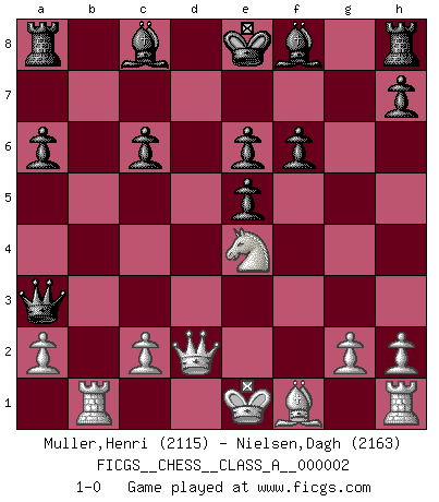 Last move : 1-0 2006 July 5 12:47:57 [Event "FICGS__CHESS__CLASS_A__000002"] [Site "FICGS"] [Date "2006.04.10"] [Round "1"] [White "Muller,Henri"] [Black "Nielsen,Dagh"] [Result "1-0"] [WhiteElo "2115"] [BlackElo "2163"] 1.e4 c5 2.Nf3 d6 3.d4 cxd4 4.Nxd4 Nf6 5.Nc3 a6 6.Bg5 e6 7.f4 Qb6 8.Qd2 Qxb2 9.Rb1 Qa3 10.f5 Nc6 11.fxe6 fxe6 12.Nxc6 bxc6 13.e5 dxe5 14.Bxf6 gxf6 15.Ne4 1-0 This chess game has been lost on time (started : 2006.04.10 15:33:23) Sicilian : Najdorf, 7...Qb6 Player White won this chess game. Follow this game move after move (download)The beauty of a move lies not in its' appearance but in the thought behind it. (Siegbert Tarrasch) Ich glaube, ich kenne inzwischen die Gründe für mein Versagen: schachliche Charakterfehler. Ich war nie ein Wunderkind und in meiner gesamten menschlichen Entwicklung immer zu langsam. (Viktor Kortschnoi) Si no le temes a Spassky, entonces elimino el elemento del dinero. (Jim Slater) Seul un grand joueur sait à quel point il joue faiblement. (Xavier Tartacover) Two beer, or not two beer. (Unknown)