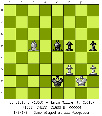 Last move : 1/2-1/2 2007 February 12 19:14:12 [Event "FICGS__CHESS__CLASS_B__000004"] [Site "FICGS"] [Date "2006.06.19"] [Round "1"] [White "Bonoldi,Fabio"] [Black "Marin Millan,Jose Antonio"] [Result "1/2-1/2"] [WhiteElo "1963"] [BlackElo "2010"] 1.c4 Nf6 2.Nc3 g6 3.g3 Bg7 4.Bg2 O-O 5.e4 d6 6.Nge2 c5 7.O-O Nc6 8.d3 a6 9.h3 Rb8 10.Be3 b5 11.cxb5 axb5 12.d4 b4 13.Nd5 Nd7 14.dxc5 dxc5 15.Qa4 Bb7 16.Rad1 e6 17.Ndf4 e5 18.Nd3 Nd4 19.Nxd4 exd4 20.Bf4 Ra8 21.Qc2 Re8 22.Nxc5 Qc8 23.Rc1 Nxc5 24.Qxc5 Qxc5 25.Rxc5 Rxa2 26.Rb1 Bf8 27.Rc4 Bxe4 28.Bxe4 Rxe4 29.Be3 h5 30.Rxd4 Rxd4 31.Bxd4 Bg7 32.Bc5 Rxb2 33.Rxb2 Bxb2 34.Bxb4 f5 35.Kg2 Kf7 36.f3 Ke6 37.g4 Be5 38.gxh5 gxh5 39.Bd2 Kd5 40.Bg5 Kd4 41.Bc1 Kd3 42.Bg5 Bc7 43.Bf6 Bf4 44.Be7 Ke3 45.Bf6 Ke2 46.Be7 Be5 47.Bc5 1/2-1/2 English Opening Kingside Castling by player Black (move 4) Kingside Castling by player White (move 7) 10 pieces endgame at move 34 : White KBPPP , Black KBPPP WHITE : King + 1 Bishop 3 Pawns BLACK : King + 1 Bishop 3 Pawns 9 pieces endgame at move 38 : White KBPPP , Black KBPP WHITE : King + 1 Bishop 3 Pawns BLACK : King + 1 Bishop 2 Pawns 8 pieces endgame at move 38 : White KBPP , Black KBPP WHITE : King + 1 Bishop 2 Pawns BLACK : King + 1 Bishop 2 Pawns This chess game ended in a draw. Follow this game move after move (download)Don't even mention losing to me. I can't stand to think of it. (Bobby Fischer) Wenn ich mich einlogge, glauben die Leute gewöhnlich nicht, dass ich es selbst bin und sie fangen an, mir dumme Fragen zu stellen. Und wenn sie es glauben, stellen sie wieder andere dumme Fragen. (Judith Polgar) Creo que una cierta cantidad de temperamento es esperada de los genios del Ajedrez. (Ron Gross) Donnez-moi un Cavalier en 6e et je gagnerais toutes mes parties. (Steinitz) No enterprise is more likely to succeed than one concealed from the enemy until it is ripe for execution. (Niccolo Machiavelli)