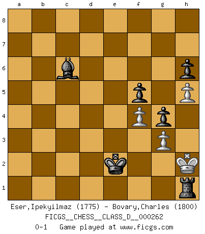Last move : 0-1 2020 June 14 17:12:2 [Event "FICGS__CHESS__CLASS_D__000262"] [Site "FICGS"] [Date "2020.02.16"] [Round "1"] [White "Eser,Ipekyilmaz"] [Black "Bovary,Charles"] [Result "0-1"] [WhiteElo "1775"] [BlackElo "1800"] 1.a3 g6 2.g3 Bg7 3.Bg2 d5 4.d3 e5 5.h3 Ne7 6.h4 h6 7.Nh3 Nbc6 8.a4 Be6 9.Na3 Qd7 10.Bd2 O-O 11.h5 g5 12.f3 Nf5 13.Kf2 e4 14.fxe4 dxe4 15.Bxe4 Bxb2 16.Nb5 Bxa1 17.Qxa1 f6 18.Ng1 Ne5 19.Kg2 c6 20.Nc3 Nd4 21.Nf3 Nexf3 22.Bxf3 Nxc2 23.Qb2 Nd4 24.Be3 Nxf3 25.exf3 Qxd3 26.Re1 Rae8 27.Kf2 Bc4 28.Qb1 b6 29.Qxd3 Bxd3 30.Rd1 Rd8 31.Rc1 c5 32.a5 f5 33.f4 g4 34.Na4 Rd6 35.Rc3 Rfd8 36.Nb2 Kf7 37.Na4 Bb5 38.Nxc5 bxc5 39.Rxc5 Rd5 40.Rxd5 Rxd5 41.Bxa7 Rd3 42.Be3 Ke6 43.Bb6 Kd5 44.Be3 Ke4 45.Bc5 Rd2+ 46.Ke1 Kd3 47.Kf1 Kc2 48.Ke1 Rd3 49.Kf2 Rf3+ 50.Kg2 Kd3 51.Bf2 Ke2 52.Bc5 Rf1 53.Kh2 Bc6 54.Bg1 Ra1 55.a6 Rxa6 56.Bd4 Ra2 57.Kg1 Rd2 58.Bc3 Rd1+ 59.Be1 Rxe1+ 60.Kh2 Rh1+ 0-1 Anderssen's Opening Kingside Castling by player Black (move 10) 10 pieces endgame at move 59 : White KPPP , Black KRBPPP WHITE : King + 3 Pawns BLACK : King + 1 Rook 1 Bishop 3 Pawns Player Black won this chess game. Follow this game move after move (download)There are tough players and nice guys, and I'm a tough player. (Bobby Fischer) Jeder leidlich begabte Spieler, er braucht keineswegs hervorragend veranlagt zu sein, kann es zum Meister bringen. Aber das ist ja auch gar nicht nötig! Der richtige Standpunkt ist es, zu seinem Vergnügen zu spielen, und man glaube ja nicht, dass der Genuss proportional dem Können sei. (Siegbert Tarrasch) Coloca el contenido de las piezas del Ajedrez en un sombrero, agitalo vigorosamente, arrojalas en un tablero desde una altura de 30 centimetros y así obtendras el estilo de Steinitz. (H. E. Bird) On entre au jeu d'Echecs comme on entre en Religion. Pour le joueur d'Echecs, la partie d'Echecs c'est l'office, la messe, le défilé du 1er Mai, le dépôt de gerbe au Monument aux Morts. C'est un drame sacré. (Michel Roos) Computer Science is no more about computers than astronomy is about telescopes. (Edsger W. Dijkstra)