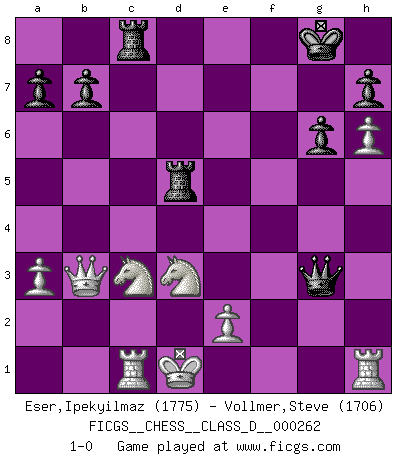 Last move : 1-0 2020 March 6 19:45:19 [Event "FICGS__CHESS__CLASS_D__000262"] [Site "FICGS"] [Date "2020.02.16"] [Round "1"] [White "Eser,Ipekyilmaz"] [Black "Vollmer,Steve"] [Result "1-0"] [WhiteElo "1775"] [BlackElo "1706"] 1.a3 c5 2.g3 d5 3.Bg2 e5 4.d3 f5 5.h3 Nf6 6.Bg5 Be7 7.Bxf6 Bxf6 8.h4 Nc6 9.Nh3 O-O 10.h5 Be6 11.h6 g6 12.f3 Qc7 13.Kd2 e4 14.Nf4 Bf7 15.fxe4 dxe4 16.Kc1 c4 17.dxe4 Qb6 18.c3 Rad8 19.Nd2 Nd4 20.cxd4 c3 21.bxc3 Rc8 22.Qc2 Bxd4 23.Nb1 fxe4 24.Bxe4 Rfd8 25.Nd3 Bxc3 26.Nxc3 Qe3+ 27.Kd1 Qxg3 28.Rc1 Bd5 29.Bxd5+ Rxd5 30.Qb3 1-0 Anderssen's Opening Kingside Castling by player Black (move 9) Player White won this chess game. Follow this game move after move (download)Without error there can be no brilliancy. (Emanuel Lasker) Der Verteidiger gebe der Gewalt nach, aber nur der Gewalt. Er schaffe sich nicht freiwillig, etwa aus Blindheit oder aus Schrecken, irgendwelche Schwächen. Er lasse sich nicht bluffen. (Emanuel Lasker) Solo existe una cosa que Fischer hace en el Ajedrez sin placer: ¡perder!. (Boris Spassky) Si le désir cupide (et stupide) de gagner est une inépuisable source de souffrance, une combinaison brillante sur l'échiquier est une découverte : le coquelicot qui s'épanouit lorsque apparaît la Voie Lactée. (Arrabal) Man with more than one clock never knows what time it is. (Chinese thought)