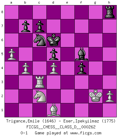 Last move : 0-1 2020 April 13 9:13:37 [Event "FICGS__CHESS__CLASS_D__000262"] [Site "FICGS"] [Date "2020.02.16"] [Round "1"] [White "Trigance,Emile"] [Black "Eser,Ipekyilmaz"] [Result "0-1"] [WhiteElo "1646"] [BlackElo "1775"] 1.e4 f6 2.d4 e6 3.f4 f5 4.exf5 exf5 5.Bd3 d6 6.Nf3 a6 7.O-O h6 8.Re1+ Kf7 9.Bc4+ Kg6 10.g3 Kh7 11.Ng5+ hxg5 12.Qh5+ Nh6 13.fxg5 d5 14.Bd3 g6 15.Qh4 Nc6 16.c3 Bd7 17.Na3 Kg8 18.gxh6 Bxh6 19.Qxd8+ Rxd8 20.Nc2 Re8 21.Rxe8+ Bxe8 22.Bxh6 Rxh6 23.Re1 Bf7 24.Ne3 Rh7 25.Bf1 Kf8 26.Bg2 Ne7 27.a4 a5 28.Rb1 Rh8 29.b4 axb4 30.cxb4 Ke8 31.a5 Kd7 32.Rc1 Be6 33.Bf3 Kd6 34.Rc3 f4 35.Nc2 Bf5 36.Kg2 g5 37.Bd1 Nc6 38.gxf4 gxf4 0-1 Barnes defense Kingside Castling by player White (move 7) Player Black won this chess game. Follow this game move after move (download)I am still a victim of Chess. It has all the beauty of art and much more. It cannot be commercialized. Chess is much purer than art in its social position. (Marcel Duchamp) Smyslow ist ein Beweis dafür, dass ich noch zehn Jahre spielen kann! [der 75 jährige über den 85 jährigen] (Viktor Kortschnoi) El juego de Fischer siempre fue nítido, racional y brillante. Uno de los mejores por siempre. (Dave Regis) Mon pion favori sur ma case favorite ! Bronstein en parlant d'un coup de pion en h5 quand il avait les Noirs. You must do what you feel is right... of course. (Obi-Wan Kenobi in Star Wars ep.4)