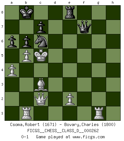Last move : 0-1 2020 March 1 19:25:43 [Event "FICGS__CHESS__CLASS_D__000262"] [Site "FICGS"] [Date "2020.02.16"] [Round "1"] [White "Csoma,Robert"] [Black "Bovary,Charles"] [Result "0-1"] [WhiteElo "1671"] [BlackElo "1800"] 1.c4 e5 2.Nc3 Nf6 3.d3 d5 4.cxd5 Nxd5 5.Bd2 Nc6 6.Nf3 Be7 7.g3 h5 8.h4 f6 9.Bg2 Be6 10.a3 Qd7 11.Rc1 Nxc3 12.Bxc3 O-O-O 13.Qa4 Kb8 14.b4 a6 15.Qc2 Bd5 16.O-O g5 17.Rb1 gxh4 18.Nxh4 Bxg2 19.Kxg2 f5 20.Ng6 Rhg8 21.Nxe7 Qxe7 22.a4 h4 23.b5 hxg3 24.fxg3 Rxg3+ 25.Kxg3 Rg8+ 26.Kf3 e4+ 27.dxe4 Qg5 28.Rg1 fxe4+ 29.Kxe4 Re8+ 30.Kf3 Qe3+ 31.Kg4 Rg8+ 32.Kf5 Qf2+ 33.Ke4 Re8+ 34.Kd5 Qf7+ 35.Kc5 b6+ 0-1 English Opening Queenside Castling by player Black (move 12) Kingside Castling by player White (move 16) Player Black won this chess game. Follow this game move after move (download)After black's reply to 1.e4 with 1..e5, leaves him always trying to get into the game. (Howard Staunton) Dass jemand wie Surab Asmaiparaschwili, der selbst Elopunkte gekauft hat , Vize-Präsident der Fide werden konnte, sagt schon einges über den Zustand dieser Organisation aus. (Joel Lautier) Uno no tiene que jugar muy bien, es suficiente jugar mejor que el oponente. (Siegbert Tarrasch) Aidez vos pièces, elles vous aideront. (Paul Morphy) Even the best needles are not sharp at both ends. (Chinese proverb)