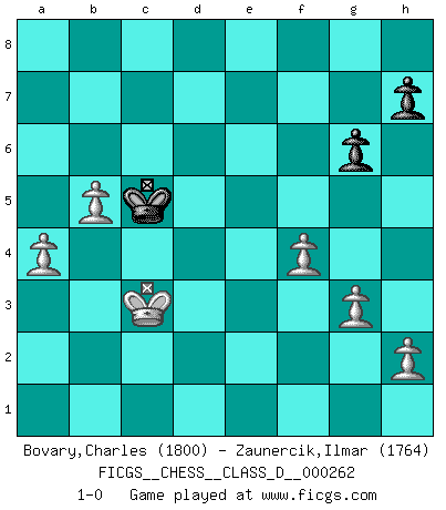 Last move : 1-0 2020 March 15 13:4:10 [Event "FICGS__CHESS__CLASS_D__000262"] [Site "FICGS"] [Date "2020.02.16"] [Round "1"] [White "Bovary,Charles"] [Black "Zaunercik,Ilmar"] [Result "1-0"] [WhiteElo "1800"] [BlackElo "1764"] 1.d4 d5 2.e4 dxe4 3.f3 e5 4.Nc3 exd4 5.Nxe4 Nf6 6.Bg5 Be7 7.Bxf6 Bxf6 8.Bb5+ c6 9.Bd3 Bh4+ 10.g3 Be7 11.f4 Nd7 12.Nf3 O-O 13.Qe2 Re8 14.O-O-O Bf8 15.Nfg5 g6 16.Bc4 Re7 17.Bxf7+ Rxf7 18.Nxf7 Qe7 19.Nfd6 Nb6 20.Nxc8 Rxc8 21.Rxd4 Bg7 22.Rd2 Qb4 23.c3 Qe7 24.Re1 Nd5 25.c4 b5 26.cxd5 cxd5 27.Nc3 Qxe2 28.Rdxe2 d4 29.Re8+ Rxe8 30.Rxe8+ Kf7 31.Ra8 dxc3 32.Rxa7+ Kg8 33.Rxg7+ Kxg7 34.bxc3 Kf6 35.Kc2 Kf5 36.c4 Ke4 37.cxb5 Kd5 38.Kc3 Kc5 39.a4 1-0 Blackmar gambit Kingside Castling by player Black (move 12) Queenside Castling by player White (move 14) 10 pieces endgame at move 34 : White KPPPPP , Black KPPP WHITE : King + 5 Pawns BLACK : King + 3 Pawns 9 pieces endgame at move 37 : White KPPPPP , Black KPP WHITE : King + 5 Pawns BLACK : King + 2 Pawns Player White won this chess game. Follow this game move after move (download)When asked, -How is that you pick better moves than your opponents?, I responded: I'm very glad you asked me that, because, as it happens, there is a very simple answer. I think up my own moves, and I make my opponent think up his. (Alexander Alekhine) Modernes Schach sorgt sich zuviel um Dinge wie Bauernstruktur usw. Vergessen Sie das, Schachmatt beendet das Spiel! (Nigel Short) Un jugador que es sorprendido, esta derrotado a medias. (Proverbio) Le jeu d'échecs est comme rejeté hors du temps. (Antoine de Saint-Exupéry) The weakness of an artist is dogma. (Josh Waitzkin)