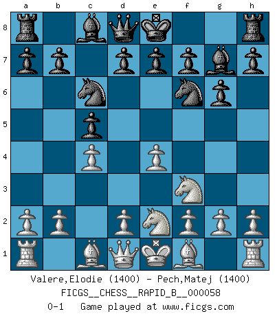 Last move : 0-1 2007 August 24 11:22:4 [Event "FICGS__CHESS__RAPID_B__000058"] [Site "FICGS"] [Date "2007.07.07"] [Round "1"] [White "Valere,Elodie"] [Black "Pech,Matej"] [Result "0-1"] [WhiteElo "1400"] [BlackElo "1400"] 1.c4 c5 2.Nc3 Nc6 3.e4 g6 4.Nf3 Bg7 5.Ne2 Nf6 0-1 This chess game has been lost on time (started : 2007.07.07 22:32:15) English : Symmetrical variation Player Black won this chess game. Follow this game move after move (download)I have added these principles to the law: get the Knights into action before both Bishops are developed. (Emanuel Lasker) Ich kenne Menschen, die allen Willen der Welt besitzen und doch nicht Schach spielen können. (Robert James Fischer) El jugador de combinación piensa hacia adelante; comienza de la posición dada y trabaja las movidas contundentes en su mente. (Emanuel Lasker) Vous savez, camarade Pachman, je n'éprouve pas de plaisir à être ministre, je jouerais plutôt aux échecs comme vous, ou alors ferais une révolution au Venezuela. (Che Guevara à Ludek Pachman, 'Checkmate in Prague', 1975) Art disturbs, science reassures. (Georges Braque, Le Jour et la Nuit)