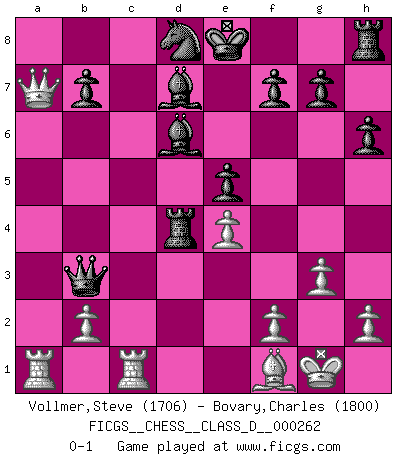 Last move : 0-1 2020 February 18 10:20:36 [Event "FICGS__CHESS__CLASS_D__000262"] [Site "FICGS"] [Date "2020.02.16"] [Round "1"] [White "Vollmer,Steve"] [Black "Bovary,Charles"] [Result "0-1"] [WhiteElo "1706"] [BlackElo "1800"] 1.d4 Nf6 2.Nf3 e6 3.g3 c5 4.Bg2 cxd4 5.Nxd4 d5 6.O-O e5 7.Nb3 Be6 8.c4 Nc6 9.cxd5 Nxd5 10.e4 Ndb4 11.N1d2 Qb6 12.Qe2 Rd8 13.Nf3 Nxa2 14.Rxa2 Qxb3 15.Ra1 Bc4 16.Qe3 Rd3 17.Qg5 Rxf3 18.Be3 h6 19.Qg4 Rxe3 20.Qc8+ Nd8 21.Bh3 Rd3 22.Rfc1 Bb5 23.Bf1 Bd7 24.Qb8 Bd6 25.Qxa7 Rd4 0-1 Queen's pawn game Kingside Castling by player White (move 6) Player Black won this chess game. Follow this game move after move (download)Of all my Russian books, the defense contains and diffuses the greatest 'warmth' which may seem odd seeing how supremely abstract Chess is supposed to be. (Vladimir Nabokov) Schon mancher Spieler hat aufgegeben, um zu vermeiden, daß er eine Figur verliert. (Savielly Grigorievitsch Tartakower) El Ajedrez es tortura mental. (Garry Kasparov) On peut tirer plus d'utilité d'une partie perdue que de 100 parties gagnées. (Capablanca) Creativity involves breaking out of established patterns in order to look at things in a different way. (Edward De Bono)