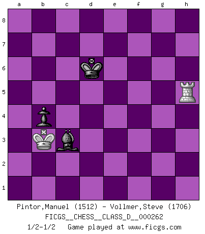 Last move : 1/2-1/2 2020 March 17 2:18:24 [Event "FICGS__CHESS__CLASS_D__000262"] [Site "FICGS"] [Date "2020.02.16"] [Round "1"] [White "Pintor,Manuel"] [Black "Vollmer,Steve"] [Result "1/2-1/2"] [WhiteElo "1512"] [BlackElo "1706"] 1.e4 e6 2.f4 d5 3.exd5 exd5 4.d4 Nf6 5.Nf3 Bd6 6.Bd3 Nc6 7.O-O O-O 8.c3 Bg4 9.h3 Bxf3 10.Qxf3 Re8 11.Nd2 Qe7 12.Qg3 Qe3+ 13.Qxe3 Rxe3 14.Nf3 Rxd3 15.Kh2 Rxf3 16.Rxf3 Ne4 17.g3 f5 18.Be3 Re8 19.g4 fxg4 20.hxg4 Na5 21.Kh3 Nc4 22.Bc1 c5 23.b3 Ncd2 24.Bxd2 Nxd2 25.Rf2 Re3+ 26.Kg2 Ne4 27.Rf3 Rxf3 28.Kxf3 Kf7 29.g5 g6 30.dxc5 Bxc5 31.c4 Nc3 32.cxd5 Nxd5 33.Rd1 Ke6 34.Re1+ Kd6 35.Re8 Kc6 36.Rh8 Bd6 37.Rxh7 Nxf4 38.Ke4 Ne6 39.Kd3 Nxg5 40.Rh6 Ne6 41.Kc4 Nf4 42.b4 b5+ 43.Kb3 g5 44.a4 a6 45.a5 Nd5 46.Rg6 Nxb4 47.Rxg5 Nd5 48.Rg6 Kc5 49.Rg8 Bc7 50.Ra8 Bxa5 51.Rxa6 Bb6 52.Ra8 Nc7 53.Rb8 Kc6 54.Rc8 Ba7 55.Rh8 Kc5 56.Rh7 Kc6 57.Rh6+ Kc5 58.Rh7 Bb6 59.Rh6 Nd5 60.Rh5 Ba5 61.Rg5 Bd2 62.Rg3 b4 63.Rg4 Ne3 64.Rg5+ Kd4 65.Rh5 Nd5 66.Rh4+ Kc5 67.Rc4+ Kb5 68.Rd4 Bc3 69.Rxd5+ Kc6 70.Rh5 Kd6 1/2-1/2 French : Labourdonnais variation Kingside Castling by player White (move 7) Kingside Castling by player Black (move 7) 10 pieces endgame at move 39 : White KRPP , Black KBNPPP WHITE : King + 1 Rook 2 Pawns BLACK : King + 1 Bishop 1 Knight 3 Pawns 9 pieces endgame at move 46 : White KRP , Black KBNPPP WHITE : King + 1 Rook 1 Pawn BLACK : King + 1 Bishop 1 Knight 3 Pawns 8 pieces endgame at move 47 : White KRP , Black KBNPP WHITE : King + 1 Rook 1 Pawn BLACK : King + 1 Bishop 1 Knight 2 Pawns 7 pieces endgame at move 50 : White KR , Black KBNPP WHITE : King + 1 Rook BLACK : King + 1 Bishop 1 Knight 2 Pawns 6 pieces endgame at move 51 : White KR , Black KBNP WHITE : King + 1 Rook BLACK : King + 1 Bishop 1 Knight 1 Pawn 5 pieces endgame at move 69 : White KR , Black KBP WHITE : King + 1 Rook BLACK : King + 1 Bishop 1 Pawn This chess game ended in a draw. Follow this game move after move (download)Fischer is completely natural. He plays no roles. He's like a child. Very, very simple. (Zita Rajcsanyi) Man braucht nicht immer den besten Zug zu spielen: Ein Zug muß aktiv, unternehmungslustig, korrekt und schön sein. (David Bronstein) ¿Esta Bobby Fischer algo cuerdo?. (Salo Flohr) La tactique, c'est ce que vous faites quand il y a quelque chose à faire; la stratégie, c'est ce que vous faites quand il n'y a rien à faire. (Savielli Tartacower) Life is like internet, nothing interesting, but noone want to leave it. (Ilmars Cirulis)