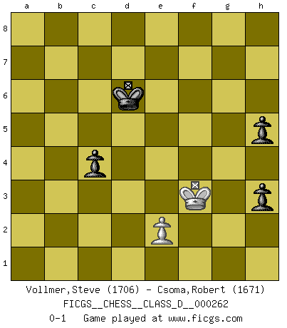 Last move : 0-1 2020 March 28 22:22:22 [Event "FICGS__CHESS__CLASS_D__000262"] [Site "FICGS"] [Date "2020.02.16"] [Round "1"] [White "Vollmer,Steve"] [Black "Csoma,Robert"] [Result "0-1"] [WhiteElo "1706"] [BlackElo "1671"] 1.d4 f5 2.c4 Nf6 3.Nc3 e6 4.Nf3 Be7 5.Bg5 O-O 6.g3 h6 7.Bd2 d5 8.Bg2 c6 9.cxd5 exd5 10.O-O Be6 11.Qc2 Ne4 12.Nxe4 dxe4 13.Ne5 Qxd4 14.Bc3 Qb6 15.Rfd1 Rd8 16.Rxd8+ Bxd8 17.b3 Nd7 18.Rd1 Nxe5 19.Bxe5 Be7 20.Qb2 Bf8 21.g4 Rd8 22.Rxd8 Qxd8 23.gxf5 Bxf5 24.Qc2 Qd5 25.Bf4 Qe6 26.Be3 a6 27.Qd2 Be7 28.f3 exf3 29.Bxf3 Qg6+ 30.Kh1 Qe6 31.Bf2 Be4 32.Qe3 Bxf3+ 33.Qxf3 Qf6 34.Kg2 Qxf3+ 35.Kxf3 Kf7 36.Bd4 g6 37.Ke4 Ke6 38.h3 Bd8 39.Be5 b6 40.Bg7 h5 41.Be5 Bf6 42.Bc7 b5 43.Bb6 Be7 44.Bd4 c5 45.Be3 g5 46.Bf2 a5 47.Be3 a4 48.Bf2 axb3 49.axb3 Bd6 50.Be3 g4 51.Bf4 gxh3 52.Bxd6 Kxd6 53.Kf3 c4 54.bxc4 bxc4 0-1 Dutch with c4 & Nc3 Kingside Castling by player Black (move 5) Kingside Castling by player White (move 10) 10 pieces endgame at move 51 : White KBPP , Black KBPPPP WHITE : King + 1 Bishop 2 Pawns BLACK : King + 1 Bishop 4 Pawns 9 pieces endgame at move 52 : White KBPP , Black KPPPP WHITE : King + 1 Bishop 2 Pawns BLACK : King + 4 Pawns 8 pieces endgame at move 52 : White KPP , Black KPPPP WHITE : King + 2 Pawns BLACK : King + 4 Pawns 7 pieces endgame at move 54 : White KPP , Black KPPP WHITE : King + 2 Pawns BLACK : King + 3 Pawns 6 pieces endgame at move 54 : White KP , Black KPPP WHITE : King + 1 Pawn BLACK : King + 3 Pawns Player Black won this chess game. Follow this game move after move (download)Bobby Fischer is the greatest Chess player who has ever lived. (Ken Smith) Wenn Du nicht kämpfst, um anderen etwas zu beweisen, sondern nur für Dich selbst, dann bist du fast unbesiegbar. (Garry Kasparov) El pensamiento metódico es mas útil en el Ajedrez que la inspiración. (C. J. S. Purdy) Même un GMI sait rarement calculer sur plus de cinq coups une attaque à sacrifices. (Rudolf Spielmann) I feel so... helpless. (C-3PO in Star Wars ep.3)