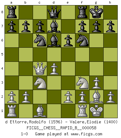 Last move : 1-0 2007 August 22 11:3:30 [Event "FICGS__CHESS__RAPID_B__000058"] [Site "FICGS"] [Date "2007.07.07"] [Round "1"] [White "d Ettorre,Rodolfo"] [Black "Valere,Elodie"] [Result "1-0"] [WhiteElo "1596"] [BlackElo "1400"] 1.Nf3 d5 2.g3 Nc6 3.d4 e6 4.Bg2 Nf6 5.O-O Bd6 6.c4 O-O 7.Nc3 dxc4 8.Qa4 Bd7 9.Qxc4 1-0 This chess game has been lost on time (started : 2007.07.07 22:32:15) Reti : King's Indian attack (Barcza system) Kingside Castling by player White (move 5) Kingside Castling by player Black (move 6) Player White won this chess game. Follow this game move after move (download)I had a toothache during the first game. In the second game I had a headache. In the third game it was an attack of rheumatism. In the fourth game, I wasn't feeling well. And in the fifth game? Well, must one have to win every game ? (Siegbert Tarrasch) Ich könnte leicht behaupten: Ja,ja, Leonid Breschnew wollte nicht, daß ich Weltmeister werde. In der Tat war die Sache komplizierter. (Viktor Kortschnoi) La pasion por jugar al Ajedrez es una de las mas inexplicables en el mundo. (H.G. Wells) C'est une question de caractère, Beaucoup de gens perdent leur motivation très vite. D'autres, ils sont rares, peuvent la conserver très longtemps. J'aime les échecs, encore aujourd'hui je suis heureux d'analyser des parties. J'aime toujours gagner, je déteste encore perdre. Bien jouer est important pour mon intégrité intellectuelle et morale. Et puis les échecs vivent en ce moment une période historique grâce à Internet. Ils se développent dans les systèmes éducatifs à travers le monde. Ils sortent de leur ghetto, et c'est mon rôle de mener à bien cette révolution. (Gary Kasparov) Industry executives and analysts often mistakenly talk about strategy as if it were some kind of chess match. But in chess, you have just two opponents, each with identical resources, and with luck playing a minimal role. The real world is much more like a poker game, with multiple players trying to make the best of whatever hand fortune has dealt them. In our industry, Bill Gates owns the table until someone proves otherwise. (David Moschella, 'Computerworld')