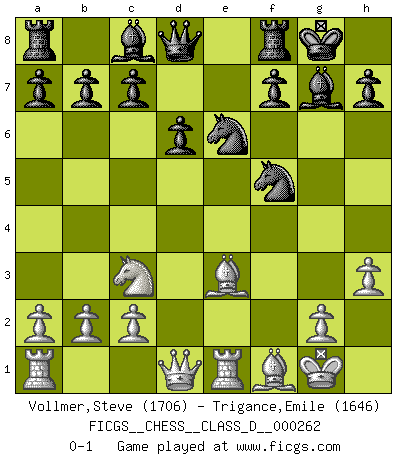 Last move : 0-1 2020 February 23 16:54:1 [Event "FICGS__CHESS__CLASS_D__000262"] [Site "FICGS"] [Date "2020.02.16"] [Round "1"] [White "Vollmer,Steve"] [Black "Trigance,Emile"] [Result "0-1"] [WhiteElo "1706"] [BlackElo "1646"] 1.d4 d6 2.e4 Nf6 3.Nc3 g6 4.Nf3 Bg7 5.h3 O-O 6.Bd3 Nc6 7.O-O Nd7 8.Be3 e5 9.Re1 exd4 10.Nxd4 Nxd4 11.f4 Nc5 12.Bf1 Nce6 13.f5 gxf5 14.exf5 Nxf5 0-1 Queen's Pawn Kingside Castling by player Black (move 5) Kingside Castling by player White (move 7) Player Black won this chess game. Follow this game move after move (download)Spassky will not be psyched out by Fischer. (Mike Goodall) Ich liebe den Moment, wenn ich das Ego meines Gegenüber breche. (Robert James Fischer) El juego de Fischer siempre fue nítido, racional y brillante. Uno de los mejores por siempre. (Dave Regis) A chaque perte on perd un peu de soi. (Joël Lautier) Computers have lots of memory but no imagination. (Anonymous)