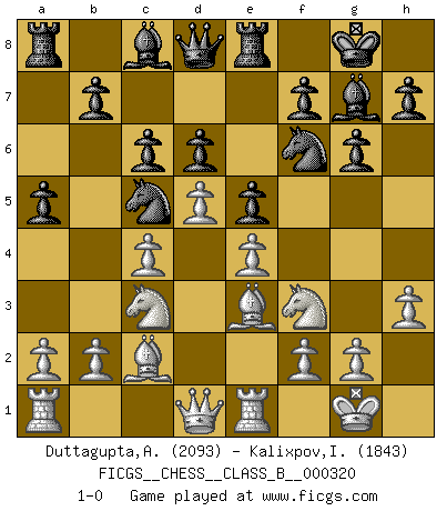 Last move : 1-0 2020 July 3 2:21:1 [Event "FICGS__CHESS__CLASS_B__000320"] [Site "FICGS"] [Date "2020.02.16"] [Round "1"] [White "Duttagupta,Aniruddha"] [Black "Kalixpov,Ivan"] [Result "1-0"] [WhiteElo "2093"] [BlackElo "1843"] 1.d4 Nf6 2.c4 g6 3.Nc3 Bg7 4.e4 d6 5.Nf3 O-O 6.h3 Re8 7.Bd3 e5 8.d5 c6 9.O-O Nbd7 10.Re1 Nc5 11.Bc2 a5 12.Be3 1-0 This chess game has been lost on time (started : 2020.02.16 16:0:30) King's Indian : 5.Nf3 Kingside Castling by player Black (move 5) Kingside Castling by player White (move 9) Player White won this chess game. Follow this game move after move (download)As one by one I mowed them down, my superiority soon became apparent. (Jose Capablanca) Wir irren allesamt, nur jeder irrt anders. (Georg Christoph Lichtenberg) La esencia del Ajedrez es pensar acerca de lo que el Ajedrez es. (David Bronstein) Comme les marins qui ont mille raisons différentes d'aller en mer, les joueurs d'échecs en ont tout autant avant de s'installer devant une table et jouer... (Vincent Bertignac, philosophe) The man who strikes first admits that his ideas have given out. (Chinese proverb)