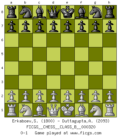 Last move : 0-1 2020 March 28 0:7:47 [Event "FICGS__CHESS__CLASS_B__000320"] [Site "FICGS"] [Date "2020.02.16"] [Round "1"] [White "Erkaboev,Sami"] [Black "Duttagupta,Aniruddha"] [Result "0-1"] [WhiteElo "1800"] [BlackElo "2093"] 0-1 This chess game has been lost on time (started : 2020.02.16 16:0:30) Player Black won this chess game. Follow this game move after move (download)When you absolutely don't know what to do anymore, it is time to panic. (John van der Wiel) Schach ist das schnellste Spiel der Welt, weil man in jeder Sekunde Tausende von Gedanken ordnen muß. (Albert Einstein) Solo puedes ser bueno en el Ajedrez si amas al juego. (Bobby Fischer) C'est une question de caractère, Beaucoup de gens perdent leur motivation très vite. D'autres, ils sont rares, peuvent la conserver très longtemps. J'aime les échecs, encore aujourd'hui je suis heureux d'analyser des parties. J'aime toujours gagner, je déteste encore perdre. Bien jouer est important pour mon intégrité intellectuelle et morale. Et puis les échecs vivent en ce moment une période historique grâce à Internet. Ils se développent dans les systèmes éducatifs à travers le monde. Ils sortent de leur ghetto, et c'est mon rôle de mener à bien cette révolution. (Gary Kasparov) They say poker is a zero-sum game. It must be, because every time I play my sum ends up zero. (Max Shapiro)