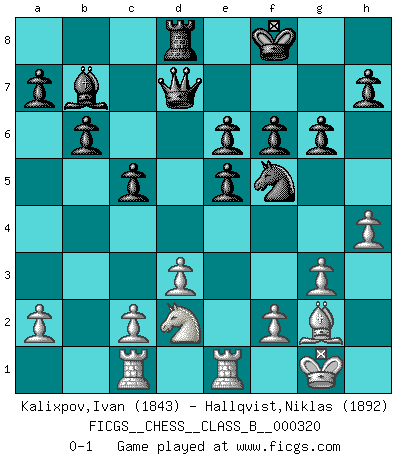 Last move : 0-1 2020 March 24 18:35:59 [Event "FICGS__CHESS__CLASS_B__000320"] [Site "FICGS"] [Date "2020.02.16"] [Round "1"] [White "Kalixpov,Ivan"] [Black "Hallqvist,Niklas"] [Result "0-1"] [WhiteElo "1843"] [BlackElo "1892"] 1.e4 e6 2.d3 c5 3.Nf3 Nc6 4.g3 g6 5.Bg2 Bg7 6.Nbd2 Nge7 7.O-O d6 8.Re1 O-O 9.Nf1 b6 10.h4 Bb7 11.Bf4 Bxb2 12.Rb1 Bg7 13.e5 Nd5 14.Bd2 dxe5 15.Ne3 Nxe3 16.Bxe3 Qd7 17.Qd2 Rad8 18.Bh6 Bxh6 19.Qxh6 f6 20.Nd2 Nd4 21.Rbc1 Nf5 22.Qxf8+ Kxf8 0-1 French : King's Indian attack Kingside Castling by player White (move 7) Kingside Castling by player Black (move 8) Player Black won this chess game. Follow this game move after move (download)If I win a tournament, I win it by myself. I do the playing. Nobody helps me. (Bobby Fischer) Ich brauche nur einen Blick auf das Schachbrett zu werfen, und weiß schon, was in der Stellung steckt, was geschehen kann und was geschehen wird. Alle übrigen suchen und prüfen, ich aber weiß es! (José Raúl Capablanca) Fischer no está bajo la obligación de nadie. (Joseph Platz) Les pièces de l'échiquier étaient impitoyables. Elles le retenaient, elles l'absorbaient. Il y avait de l'horreur en cela, mais aussi une harmonie unique. Car, qu'y a-t-il dans le monde, à part les échecs ? (V. Nabokov) The ultimate in disposing one's troops is to be without ascertainable shape. Then the most penetrating spies cannot pry in nor can the wise lay plans against you. (Sun Tzu)