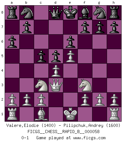 Last move : 0-1 2007 August 18 4:18:23 [Event "FICGS__CHESS__RAPID_B__000058"] [Site "FICGS"] [Date "2007.07.07"] [Round "1"] [White "Valere,Elodie"] [Black "Pilipchuk,Andrey"] [Result "0-1"] [WhiteElo "1400"] [BlackElo "1600"] 1.e4 c6 2.d4 d5 3.e5 Bf5 4.Nc3 a6 5.Bd3 Bxd3 6.Qxd3 e6 7.Nf3 c5 0-1 This chess game has been lost on time (started : 2007.07.07 22:32:15) Caro-Kann : Advance variation Player Black won this chess game. Follow this game move after move (download)Chess is life. (Bobby Fischer) Ich suche im Schach immer etwas Eigenes. Riskantes Spiel im Stile schachlicher Musketiere ist nicht meine Sache, auch wenn es vielen Freunden scharfer Wendungen gefällt. (Anatoly Karpov) Coloca el contenido de las piezas del Ajedrez en un sombrero, agitalo vigorosamente, arrojalas en un tablero desde una altura de 30 centimetros y así obtendras el estilo de Steinitz. (H. E. Bird) Shah mat. Le roi est mort. Cri de fierté d'un joueur venant de terrasser son adversaire, courtoisement, sans effusion de sang. This is where the fun begins. (Anakin Skywalker in Star Wars ep.3)