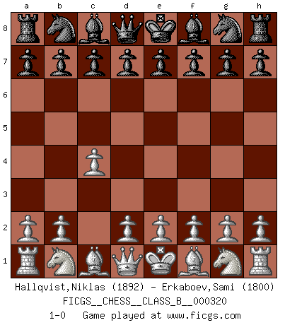 Last move : 1-0 2020 March 28 0:7:47 [Event "FICGS__CHESS__CLASS_B__000320"] [Site "FICGS"] [Date "2020.02.16"] [Round "1"] [White "Hallqvist,Niklas"] [Black "Erkaboev,Sami"] [Result "1-0"] [WhiteElo "1892"] [BlackElo "1800"] 1.c4 1-0 This chess game has been lost on time (started : 2020.02.16 16:0:30) English Opening Player White won this chess game. Follow this game move after move (download)When you are lonely, when you feel yourself an alien in the world, play Chess. This will raise your spirits and be your counselor in war. (Aristotle) Wenn ich gewinne bin ich ein Genie. Wenn nicht, dann bin ich keines. (Robert James Fischer) Hoy en día, si tu no eres un Gran Maestro a los 14 años, es mejor que lo olvides. (Anand Viswanathan) La conception d'un plan est le processus par lequel un joueur exploite les avantages de sa position tout en s'efforçant d'en réduire au minimum les inconvénients. Afin de garantir le succès, un plan doit toujours se fonder sur un diagnostic objectif des particularités d'une position. La conception d'un plan est d'autant plus difficile que la position est équilibrée, et grandement facilitée lorsqu'il n'existe qu'un seul plan susceptible de répondre aux exigences de la position. (Harry Golombek) The absolute truth is the thing that makes people laugh. (Carl Reiner)