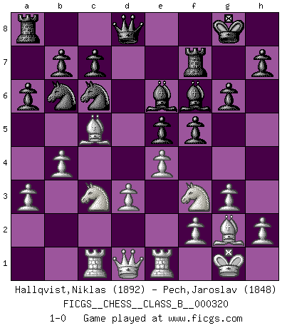 Last move : 1-0 2020 June 24 23:43:6 [Event "FICGS__CHESS__CLASS_B__000320"] [Site "FICGS"] [Date "2020.02.16"] [Round "1"] [White "Hallqvist,Niklas"] [Black "Pech,Jaroslav"] [Result "1-0"] [WhiteElo "1892"] [BlackElo "1848"] 1.c4 e5 2.g3 Nf6 3.Bg2 d5 4.cxd5 Nxd5 5.Nf3 Nc6 6.Nc3 Nb6 7.a3 Be7 8.d3 Be6 9.O-O O-O 10.Be3 f5 11.Rc1 Bf6 12.Bc5 Rf7 13.e4 g6 14.b4 a6 15.Re1 1-0 This chess game has been lost on time (started : 2020.02.16 16:0:30) English Opening Kingside Castling by player White (move 9) Kingside Castling by player Black (move 9) Player White won this chess game. Follow this game move after move (download)In a gambit you give up a Pawn for the sake of getting a lost game. (Samuel Standige Boden) Fischer ist das größte Genie, das je vom Schachhimmel heruntergestiegen ist. (Mikhail Nekhemyevich Tal) Cuando tengas duda... ¡juega al Ajedrez!. (Tevis) Les échecs c'est le défi de l'alpiniste, toujours plus haut, prêt à tout pour monter à l'assaut du Roi ennemi. Les échecs, c'est de la musique en mouvement, un ballet majestueux pour les yeux. C'est de la poésie composée par les fantômes du passé qui au même titre que Rimbaud ou Verlaine méritent notre admiration. Les échecs, c'est de la peinture ou le moindre mouvement modifie le tableau pour en faire un Picasso ou un Van Gogh. Les échecs, c'est tout et rien, c'est la vie et la mort. Jjulie33 sur le forum de France-Echecs. If we knew what we were doing, we would not call it research. (Albert Einstein)