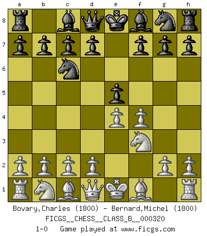 Last move : 1-0 2020 March 28 14:57:46 [Event "FICGS__CHESS__CLASS_B__000320"] [Site "FICGS"] [Date "2020.02.16"] [Round "1"] [White "Bovary,Charles"] [Black "Bernard,Michel"] [Result "1-0"] [WhiteElo "1800"] [BlackElo "1800"] 1.e4 e5 2.f4 Nc6 3.Nf3 1-0 This chess game has been lost on time (started : 2020.02.16 16:0:30) King's gambit Player White won this chess game. Follow this game move after move (download)If cunning alone were needed to excel, women would be the best Chess players. (Albin) Ich kämpfe solange mein Gegner einen Fehler machen kann. (Emanuel Lasker) El Ajedrez es el gimnasio de la mente. (Blaise Pascal) Le pion, dans sa simplicité, marche droit devant lui, mais lorsqu'il prend, il le fait obliquement? Ainsi l'homme, tant qu'il reste pauvre, marche dans la droiture et vit honnêtement, mais lorsqu'il recherche les honneurs, il flatte, se parjure et, par les voies obliques, cherche une position supérieure sur l'échiquier du monde. (Jean de Galles) Art disturbs, science reassures. (Georges Braque, Le Jour et la Nuit)