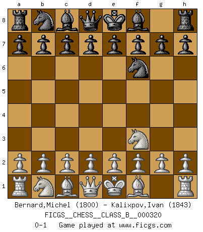 Last move : 0-1 2020 March 28 14:57:46 [Event "FICGS__CHESS__CLASS_B__000320"] [Site "FICGS"] [Date "2020.02.16"] [Round "1"] [White "Bernard,Michel"] [Black "Kalixpov,Ivan"] [Result "0-1"] [WhiteElo "1800"] [BlackElo "1843"] 1.Nf3 Nf6 0-1 This chess game has been lost on time (started : 2020.02.16 16:0:30) Reti Opening Player Black won this chess game. Follow this game move after move (download)The game of Chess is not merely an idle amusement; several very valuable qualities of the mind are to be acquired and strengthened by it, so as to become habits ready on all occasions; for life is a kind of Chess. (Benjamin Franklin) Das ganze Leben mit einer Ehefrau ist wie ein Endspiel mit ungleichfarbigen Läufern. (Viktor Kortschnoi) El Jaque al descubierto es el bombardero del tablero. (Reuben Fine) Je ne crois pas en la psychologie, je crois aux bons coups. (Robert Fischer) To be champion requires more than simply being a strong player; one has to be a strong human being as well. (Anatoly Karpov)