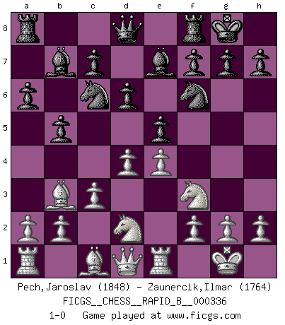 Last move : 1-0 2020 June 9 11:57:10 [Event "FICGS__CHESS__RAPID_B__000336"] [Site "FICGS"] [Date "2020.02.17"] [Round "1"] [White "Pech,Jaroslav"] [Black "Zaunercik,Ilmar"] [Result "1-0"] [WhiteElo "1848"] [BlackElo "1764"] 1.e4 e5 2.Nf3 Nc6 3.Bb5 a6 4.Ba4 Nf6 5.O-O b5 6.Bb3 Be7 7.Re1 O-O 8.c3 Bb7 9.d4 d6 10.Nbd2 1-0 This chess game has been lost on time (started : 2020.02.17 0:39:52) Ruy Lopez : 5.O-O Kingside Castling by player White (move 5) Kingside Castling by player Black (move 7) Player White won this chess game. Follow this game move after move (download)Chess is life. (Bobby Fischer) Ein bischen Romantik kann weder im Schach noch in der Liebe schaden. Also versuche ich mich ab und zu daran zu erinnern. (Nigel Short) Aquellos que dicen que entienden al Ajedrez, no entienden nada. (Robert Hubner) Mon pion favori sur ma case favorite ! Bronstein en parlant d'un coup de pion en h5 quand il avait les Noirs. Internet: Absolute communication, absolute isolation. (Paul Carvel)