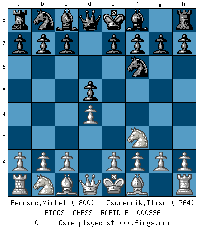 Last move : 0-1 2020 March 20 19:36:24 [Event "FICGS__CHESS__RAPID_B__000336"] [Site "FICGS"] [Date "2020.02.17"] [Round "1"] [White "Bernard,Michel"] [Black "Zaunercik,Ilmar"] [Result "0-1"] [WhiteElo "1800"] [BlackElo "1764"] 1.Nf3 Nf6 2.d4 d5 0-1 This chess game has been lost on time (started : 2020.02.17 0:39:52) Reti Opening Player Black won this chess game. Follow this game move after move (download)Let the perfectionist play postal. (Yasser Seirawan) Mutter, ich bin eben Ex-Weltmeister geworden. --beim nach Hause Kommen nach dem Verlust des WM-Titels an Mihail Botvinnik -- (Mikhail Nekhemyevich Tal) El Ajedrez es parte de la cultura, y si una cultura esta en decadencia, entonces también el Ajedrez declinará. (Mikhail Botvinnik) On est toujours la mazette de quelqu'un d'autre. (Anonyme) Everything in life is luck. (Donald Trump)