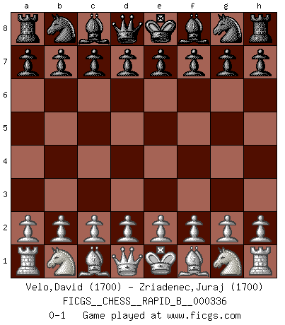 Last move : 0-1 2020 March 18 2:54:18 [Event "FICGS__CHESS__RAPID_B__000336"] [Site "FICGS"] [Date "2020.02.17"] [Round "1"] [White "Velo,David"] [Black "Zriadenec,Juraj"] [Result "0-1"] [WhiteElo "1700"] [BlackElo "1700"] 0-1 This chess game has been lost on time (started : 2020.02.17 0:39:52) Player Black won this chess game. Follow this game move after move (download)A strong memory, concentration, imagination, and a strong will is required to become a great Chess player. (Bobby Fischer) Den Ruhm habe ich schon, jetzt brauche ich noch das Geld. (Wilhelm Steinitz) Hasta este punto, las blancas han seguido un análisis bien conocido. Pero ahora el hace un error fatal: empieza a usar su propia cabeza. (Siegbert Tarrasch) On peut tirer plus d'utilité d'une partie perdue que de 100 parties gagnées. (Capablanca) When you stop learning you start dying. (M. Scott Adams)