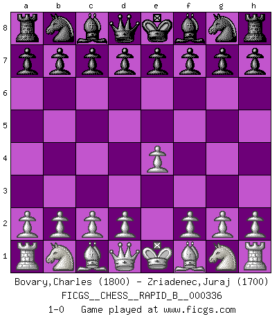 Last move : 1-0 2020 March 18 15:16:51 [Event "FICGS__CHESS__RAPID_B__000336"] [Site "FICGS"] [Date "2020.02.17"] [Round "1"] [White "Bovary,Charles"] [Black "Zriadenec,Juraj"] [Result "1-0"] [WhiteElo "1800"] [BlackElo "1700"] 1.e4 1-0 This chess game has been lost on time (started : 2020.02.17 0:39:52) King's pawn Opening Player White won this chess game. Follow this game move after move (download)I'm not a materialistic person, in that, I don't suffer the lack or loss of money. The absence of worldly goods I don't look back on. For Chess is a way I can be as materialistic as I want without having to sell my soul. (Jamie Walter Adams) Schach ist mein Leben, meine Leidenschaft, was ich gelernt habe und seit meinem 14. Lebensjahr profimässig praktiziere. Darauf zu verzichten, würde mir sehr schwer fallen. (Viktor Kortschnoi) Cuando le juegas a Fischer, no es una cuestion de si vas a ganar o perder. Es una cuestion de si vas a sobrevivir. (Boris Spassky) Les échecs c'est le défi de l'alpiniste, toujours plus haut, prêt à tout pour monter à l'assaut du Roi ennemi. Les échecs, c'est de la musique en mouvement, un ballet majestueux pour les yeux. C'est de la poésie composée par les fantômes du passé qui au même titre que Rimbaud ou Verlaine méritent notre admiration. Les échecs, c'est de la peinture ou le moindre mouvement modifie le tableau pour en faire un Picasso ou un Van Gogh. Les échecs, c'est tout et rien, c'est la vie et la mort. Jjulie33 sur le forum de France-Echecs. Don't be irreplaceable, if you can't be replaced, you can't be promoted. (Dan Rotaru)