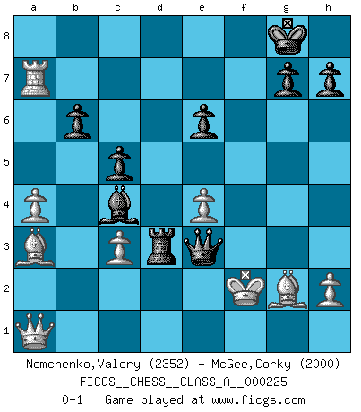 Last move : 0-1 2020 April 5 18:38:8 [Event "FICGS__CHESS__CLASS_A__000225"] [Site "FICGS"] [Date "2020.02.20"] [Round "1"] [White "Nemchenko,Valery"] [Black "McGee,Corky"] [Result "0-1"] [WhiteElo "2352"] [BlackElo "2000"] 1.d4 f5 2.c4 Nf6 3.Nc3 e6 4.Nf3 Bb4 5.a3 Bxc3+ 6.bxc3 O-O 7.e3 c5 8.Be2 b6 9.a4 Ne4 10.Ba3 Nc6 11.O-O Bb7 12.Qc2 Rc8 13.Nd2 Nxd2 14.Qxd2 d6 15.Bf3 Ba6 16.Qa2 Na5 17.Rfd1 Bxc4 18.Qb2 Qg5 19.dxc5 dxc5 20.Rd2 Nb3 21.Rd7 Nxa1 22.Qxa1 Rcd8 23.Rxa7 f4 24.e4 Rd3 25.Be2 f3 26.Bf1 fxg2 27.Bxg2 Rxf2 28.Kxf2 Qe3+ 0-1 Dutch with c4 & Nc3 Kingside Castling by player Black (move 6) Kingside Castling by player White (move 11) Player Black won this chess game. Follow this game move after move (download)The essence of Chess is thinking about what Chess is. (David Bronstein) Schach ist ein Kampf gegen den Fehler. (Johannes Herrman Zukertort) Un juego de Ajedrez es un dialogo, una conversación entre un jugador y su oponente. Cada movimiento del oponente puede contener amenazas o tropiezos, pero un jugador no se puede defender de las amenazas o tomar ventaja de los tropiezos si es que no se pregunta a sí mismo: ¿Que es lo que mi oponente va a hacer después de cada movida?. (Bruce A. Moon) Une platitude souvent récitée à propos des Echecs est qu'une des choses les plus difficiles à réaliser est de gagner une position gagnante. Cela ne manque pas de sens mais, pour ma part, j'ai toujours trouvé plus difficile de gagner une position perdante. (Tim Krabbe) For a mechanic, you seem to do an excessive amount of thinking. (C-3PO in Star Wars ep.2)