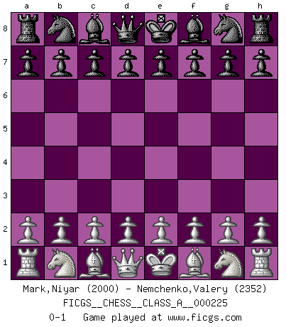Last move : 0-1 2020 March 31 19:50:48 [Event "FICGS__CHESS__CLASS_A__000225"] [Site "FICGS"] [Date "2020.02.20"] [Round "1"] [White "Mark,Niyar"] [Black "Nemchenko,Valery"] [Result "0-1"] [WhiteElo "2000"] [BlackElo "2352"] 0-1 This chess game has been lost on time (started : 2020.02.20 11:43:46) Player Black won this chess game. Follow this game move after move (download)What is the object of playing a gambit opening?... To acquire a reputation of being a dashing player at the cost of losing a game. (Siegbert Tarrasch) Im Spitzenschach von heute geht es nur um Vorbereitung, um tiefgründige, sorgfältige Eröffnungsvorbereitung. (Nigel Short) Los Peones son nacidos libres, y aún así, se encuentran por doquier encadenados. (Rick Kennedy) La tactique est l'élément le plus important du milieu de jeu. (Siegbert Tarrasch) What doesn't kill us makes us stronger. (Friedrich Nietzsche)