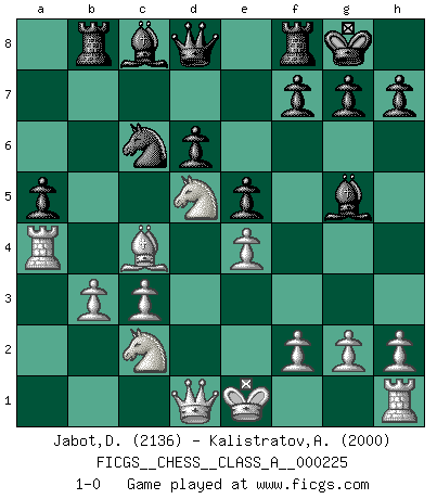 Last move : 1-0 2020 August 6 12:44:39 [Event "FICGS__CHESS__CLASS_A__000225"] [Site "FICGS"] [Date "2020.02.20"] [Round "1"] [White "Jabot,Daniel"] [Black "Kalistratov,Aleksandr"] [Result "1-0"] [WhiteElo "2136"] [BlackElo "2000"] 1.e4 c5 2.Nf3 Nc6 3.d4 cxd4 4.Nxd4 Nf6 5.Nc3 e5 6.Ndb5 d6 7.Bg5 a6 8.Na3 b5 9.Nd5 Be7 10.Bxf6 Bxf6 11.c3 O-O 12.Nc2 Bg5 13.a4 bxa4 14.Rxa4 a5 15.Bc4 Rb8 16.b3 1-0 This chess game has been lost on time (started : 2020.02.20 11:43:46) Sicilian : Pelikan (Lasker/Sveshnikov) variation Kingside Castling by player Black (move 11) Player White won this chess game. Follow this game move after move (download)A thorough understanding of the typical mating continuations makes the most complicated sacrificial combinations leading up to them not only not difficult, but almost a matter of course. (Siegbert Tarrasch) Zum Sieg gelangt man nicht, wenn man gut, sondern nur wenn man besser spielt (Savielly Grigorievitsch Tartakower) Aquel que ve no otra dirección en el juego que la de dar Jaque Mate a su oponente, nunca será un buen jugador de Ajedrez. (Euwe) Ne tendez aucun piège pour le plaisir ! Ne jouez rien dans l'espoir que l'adversaire réagisse de façon stupide ! Prenez toujours pour acquis que l'adversaire va trouver le meilleur coup ! Ne jouez jamais de coup dans l'espoir que l'adversaire ne voie pas la menace ! Chacun de vos coups doit améliorer la position d'une façon ou d'une autre. It's not the will to win, but the will to prepare to win that makes the difference. (Bear Bryant)