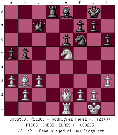 Last move : 1/2-1/2 2020 May 19 9:58:48 [Event "FICGS__CHESS__CLASS_A__000225"] [Site "FICGS"] [Date "2020.02.20"] [Round "1"] [White "Jabot,Daniel"] [Black "Rodriguez Perez,Rene"] [Result "1/2-1/2"] [WhiteElo "2136"] [BlackElo "2140"] 1.e4 e6 2.d4 d5 3.Nd2 dxe4 4.Nxe4 Be7 5.Nf3 Nd7 6.Bd3 Ngf6 7.Qe2 O-O 8.Bg5 c5 9.dxc5 Nxc5 10.Nxc5 Qa5+ 11.c3 Qxc5 12.O-O Rd8 13.Rad1 Bd7 14.Ne5 Be8 15.Rfe1 h6 16.Bf4 Rac8 17.Bg3 Bd6 18.Rd2 Bc7 19.R2d1 a5 20.h3 b5 21.a3 Rd5 22.Bc2 Rcd8 23.Rxd5 Rxd5 24.Bb3 Rd8 25.Nd3 Qb6 26.Bxc7 Qxc7 27.Ne5 1/2-1/2 French : Tarrasch Kingside Castling by player Black (move 7) Kingside Castling by player White (move 12) This chess game ended in a draw. Follow this game move after move (download)Many have become Chess Masters, no one has become the Master of Chess. (Siegbert Tarrasch) Pläne sind die Träume des Verständigen. (Ernst Freiherr von Feuchtersleben) Yo creo que el Ajedrez posee una magia que es también una ayuda en la edad avanzada. Una rodilla reumática es olvidada durante una partida de Ajedrez y otros eventos pueden parecer algo sin importancia comparada a una catástrofe en el tablero de Ajedrez. (Vlastimil Hort) D'abord les bases : Jouez et étudiez, puis étudiez et jouez, ensuite jouez et étudiez, puis étudiez et jouez. Deuxièmement : Donnez toujours le meilleur de vous-même ! (Ken Smith) Computers have lots of memory but no imagination. (Anonymous)