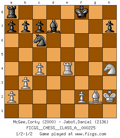 Last move : 1/2-1/2 2020 July 22 14:13:45 [Event "FICGS__CHESS__CLASS_A__000225"] [Site "FICGS"] [Date "2020.02.20"] [Round "1"] [White "McGee,Corky"] [Black "Jabot,Daniel"] [Result "1/2-1/2"] [WhiteElo "2000"] [BlackElo "2136"] 1.c4 f5 2.d4 Nf6 3.g3 g6 4.Bg2 Bg7 5.Nc3 O-O 6.Nf3 d6 7.O-O Qe8 8.b3 e5 9.dxe5 dxe5 10.e4 Nc6 11.Nd5 Qd7 12.exf5 e4 13.Nh4 gxf5 14.Nf4 Qxd1 15.Rxd1 Nh5 16.Nxh5 Bxa1 17.Ba3 Be5 18.Bxf8 Kxf8 19.g4 f4 20.Re1 Bxg4 21.Nxf4 Bxf4 22.Rxe4 Bxh2+ 23.Kxh2 Bd7 1/2-1/2 English : Anglo-Dutch defense Kingside Castling by player Black (move 5) Kingside Castling by player White (move 7) This chess game ended in a draw. Follow this game move after move (download)I believe that Chess possesses a magic that is also a help in advanced age. A rheumatic knee is forgotten during a game of Chess and other events can seem quite unimportant in comparison with a catastrophe on the chessboard. (Vlastimil Hort) Früher wurde jeder komplizierte Zug, jedes interessante Opfer mit großem Beifall und Enthusiasmus aufgenommen. Heute schaltet man einfach seinen Fritz an, und man kann sehen, was los ist, ob der Zug geht oder nicht. (Vladimir Kramnik) El muchacho (en ese entonces un niño de 12 años llamado Anatoly Karpov) no tiene ni idea de lo que es el Ajedrez y no hay futuro en absoluto para el en esta profesión. (Mikhail Botvinnik) Vouloir jouer aux échecs contre soi-même est aussi paradoxal que vouloir marcher sur son ombre. (Stefan Zweig) CHESS, n. f. [echecs, Fr.] A nice and abstruse game, in which two sets of puppets are moved in opposition to each other. (Dr Samuel Johnson, A Dictionary Of The English Language, 1755)