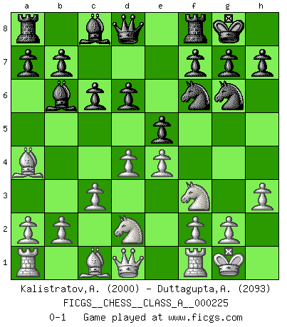 Last move : 0-1 2020 July 22 1:7:18 [Event "FICGS__CHESS__CLASS_A__000225"] [Site "FICGS"] [Date "2020.02.20"] [Round "1"] [White "Kalistratov,Aleksandr"] [Black "Duttagupta,Aniruddha"] [Result "0-1"] [WhiteElo "2000"] [BlackElo "2093"] 1.e4 e5 2.Nf3 Nc6 3.Bb5 Nf6 4.d3 Bc5 5.c3 O-O 6.Nbd2 d6 7.h3 Ne7 8.d4 Bb6 9.O-O c6 10.Ba4 Ng6 0-1 This chess game has been lost on time (started : 2020.02.20 11:43:46) Ruy Lopez : Berlin defense Kingside Castling by player Black (move 5) Kingside Castling by player White (move 9) Player Black won this chess game. Follow this game move after move (download)A good player is always lucky. (Jose Raul Capablanca) Ein Schachgenie ist jemand der verdammt gut Schach spielt. (Jonathan Levitt) Siempre es mejor sacrificar los hombres de tu oponente. (Savielly Tartakower) Les échecs sont un jeu par leur forme, un art par leur essence et une science par sa difficulté d'acquisition. Ils peuvent vous procurer autant de plaisir qu'un bon livre ou une belle musique, mais vous n'aurez une réelle joie que si vous arrivez à bien jouer. (Tigran Petrosian) When you have everything, sometimes it feels like nothing. (Horatio Caine, C.S.I. Miami)