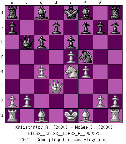 Last move : 0-1 2020 May 16 0:23:9 [Event "FICGS__CHESS__CLASS_A__000225"] [Site "FICGS"] [Date "2020.02.20"] [Round "1"] [White "Kalistratov,Aleksandr"] [Black "McGee,Corky"] [Result "0-1"] [WhiteElo "2000"] [BlackElo "2000"] 1.e4 c5 2.Nf3 e6 3.d4 cxd4 4.Nxd4 Nc6 5.Nc3 Nf6 6.Nxc6 bxc6 7.e5 Nd5 8.Ne4 Qc7 9.f4 Qb6 10.c4 Ne3 11.Qd3 Nf5 0-1 Sicilian : Taimanov variation Player Black won this chess game. Follow this game move after move (download)Bobby Fischer is the greatest Chess player who has ever lived. (Ken Smith) Ihnen, Herr Lasker, habe ich nur drei Worte zu sagen: Schach und matt. (Siegbert Tarrasch) El Ajedrez es tan inspirador que yo no creo que un buen jugador sea capaz de tener un pensamiento malo durante una partida. (Wilhelm Steinitz) On n'a jamais que l'âge auquel on a commence à jouer aux échecs car après on cesse de vieillir. (Capablanca) Nowadays, anyone who cannot speak English and is incapable of using the Internet is regarded as backward. (Al-Waleed bin Talal)