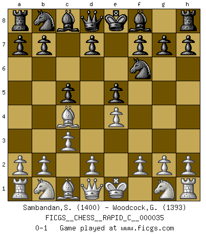 Last move : 0-1 2007 August 19 4:22:59 [Event "FICGS__CHESS__RAPID_C__000035"] [Site "FICGS"] [Date "2007.07.10"] [Round "1"] [White "Sambandan,Sanjiv"] [Black "Woodcock,Graham"] [Result "0-1"] [WhiteElo "1400"] [BlackElo "1393"] 1.e4 c5 2.c3 e5 3.Bc4 Nf6 0-1 This chess game has been lost on time (started : 2007.07.10 2:13:33) Sicilian : Alapin's variation (2.c3) Player Black won this chess game. Follow this game move after move (download)In blitz, the Knight is stronger than the Bishop. (Vlastimil Hort) Darum geht es im Schach. Einen Tag gibst du deinem Gegner eine Lektion, am nächsten Tag gibt er dir eine. (Robert James Fischer) El Ajedrez es una guerra en un tablero. El objetivo es aplastar la mente del oponente. (Bobby Fischer) Il s'avisa de me proposer d'apprendre les échecs qu'il jouait un peu... me voilà forcené des échecs. J'achète un échiquier, je m'enferme dans ma chambre, j'y passe des jours et des nuits à vouloir apprendre par cur toutes les parties. (Jean-Jacques Rousseau, Confessions) Indecision is the key to flexibility. (Unknown)