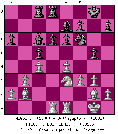 Last move : 1/2-1/2 2020 July 22 17:47:39 [Event "FICGS__CHESS__CLASS_A__000225"] [Site "FICGS"] [Date "2020.02.20"] [Round "1"] [White "McGee,Corky"] [Black "Duttagupta,Aniruddha"] [Result "1/2-1/2"] [WhiteElo "2000"] [BlackElo "2093"] 1.c4 Nf6 2.Nc3 c5 3.Nf3 e6 4.g3 b6 5.Bg2 Bb7 6.O-O Be7 7.d4 cxd4 8.Qxd4 O-O 9.e4 d6 10.Qe3 a6 11.Rd1 Nbd7 12.Nd4 Qc7 13.b3 Rfe8 14.Bb2 Rac8 15.Qe2 Bf8 16.Rac1 Qc5 17.Nc2 Qh5 18.Qxh5 Nxh5 19.Ba3 Nc5 20.f3 g5 21.Bb2 Nf6 22.Na4 Be7 23.Nxc5 bxc5 24.Re1 Bc6 25.Rcd1 Red8 26.Ne3 1/2-1/2 English Opening Kingside Castling by player White (move 6) Kingside Castling by player Black (move 8) This chess game ended in a draw. Follow this game move after move (download)Chess is a matter of delicate judgment, knowing when to punch and how to duck. (Bobby Fischer) Ich verlor meine Bürgerrechte, mein Gehalt wurde mir nicht mehr bezahlt und ich wurde zensiert und durfte nicht mehr ins Ausland reisen. [nach dem Match Fischer-Taimanov 6:0] (Mark Taimanov) Observen a Garry Kasparov. Después de una derrota, invariablemente el gana la próxima partida. Prácticamente hace pedazos a su siguiente oponente. Eso es algo que tenemos que aprender a lograr. (Maurice Ashley) On croit qu'il y a plus de mauvais joueurs que de bons joueurs, c'est faux : Il y a autant de joueurs qui gagnent que de joueurs qui perdent. (Philippe Geluck) If everyone is thinking alike, then somebody isn't thinking. (US General George S. Patton)