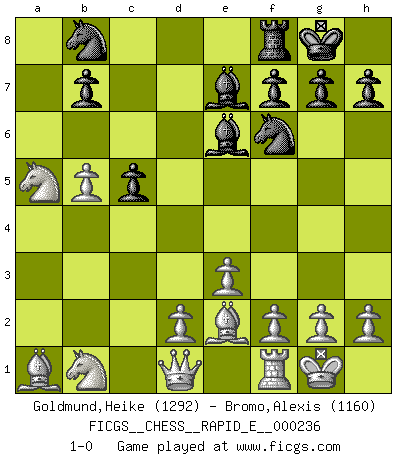 Last move : 1-0 2020 March 9 15:21:58 [Event "FICGS__CHESS__RAPID_E__000236"] [Site "FICGS"] [Date "2020.02.20"] [Round "1"] [White "Goldmund,Heike"] [Black "Bromo,Alexis"] [Result "1-0"] [WhiteElo "1292"] [BlackElo "1160"] 1.b4 e5 2.Bb2 d6 3.e3 Nf6 4.Nf3 Be7 5.c4 O-O 6.Be2 Be6 7.O-O c5 8.b5 a6 9.a4 axb5 10.axb5 Rxa1 11.Bxa1 d5 12.Nxe5 dxc4 13.Nxc4 Qa5 14.Nxa5 1-0 Polish (Sokolsky) opening Kingside Castling by player Black (move 5) Kingside Castling by player White (move 7) Player White won this chess game. Follow this game move after move (download)To avoid losing a piece, many a person has lost the game. (Savielly Tartakover) Ich tröste mich mit dem Vergnügen, daß Schachfans, Zuschauer und Leser glücklich sind, wenn ein Großmeister etwas riskiert, statt nur Klötzchen zu schieben. (Mikhail Nekhemyevich Tal) Las Aperturas te enseñan aperturas. ¡Los Finales te enseñan Ajedrez!. (Stephan Gerzadowicz) Il n'y a pas eu de défaite parce que je ne crois pas que cet ordinateur ait jamais existé. IBM a triché en refusant d'imprimer les modes de recherche de la machine. C'est évident, pendant le match, des coups décisifs ont été joués par des êtres humains. Aujourd'hui, les meilleurs spécialistes en informatique ne peuvent toujours pas expliquer comment Deep-Blue a pu jouer contre la logique des ordinateurs. IBM a gagné une guerre de communication, mais ils sont incapables de prouver que l'ordinateur a gagné tout seul. (Garry Kasparov) The greatest con, that he ever pulled... was making you believe... that he is you. (Revolver, movie)