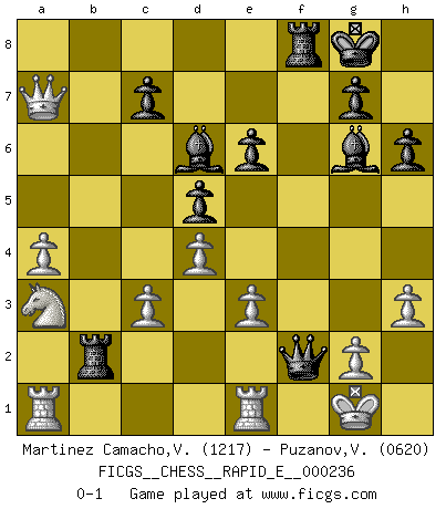 Last move : 0-1 2020 April 22 17:43:45 [Event "FICGS__CHESS__RAPID_E__000236"] [Site "FICGS"] [Date "2020.02.20"] [Round "1"] [White "Martinez Camacho,Victor Hugo"] [Black "Puzanov,Vasyl"] [Result "0-1"] [WhiteElo "1217"] [BlackElo "0620"] 1.e4 f5 2.exf5 Nf6 3.Bc4 d5 4.Bb3 Bxf5 5.Nf3 e6 6.O-O Nc6 7.d4 Be7 8.Bg5 h6 9.Be3 Na5 10.c3 Nxb3 11.Qxb3 O-O 12.Qxb7 Rb8 13.Qxa7 Rxb2 14.Nh4 Bd3 15.Re1 Ng4 16.Ng6 Bxg6 17.a4 Bd6 18.h3 Qh4 19.Na3 Nxe3 20.fxe3 Qf2+ 0-1 Fred Kingside Castling by player White (move 6) Kingside Castling by player Black (move 11) Player Black won this chess game. Follow this game move after move (download)Of Chess it has been said that life is not long enough for it, but that is the fault of life, not Chess. (William Ewart Napier) Wenn du gegen Bobby spielst, ist es keine Frage von gewinnen oder verlieren. Es ist eine Frage des Überlebens. (Boris Vassilievich Spassky) Existen dos clases de sacrificios: los correctos y los míos. (Mikhail Tal) Toutes choses étant égales, c'est la conviction qui gagne. Alliée à une volonté de vaincre, elle sert de détonateur, suscite des idées, disperse les doutes et aide à penser clairement. (Robert Fischer) Information on the Internet is subject to the same rules and regulations as conversation at a bar. (George Lundberg)