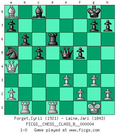 Last move : 1-0 2006 December 16 19:47:6 [Event "FICGS__CHESS__CLASS_B__000004"] [Site "FICGS"] [Date "2006.06.19"] [Round "1"] [White "Forget,Cyril"] [Black "Laine,Jari"] [Result "1-0"] [WhiteElo "1921"] [BlackElo "1843"] 1.d4 e6 2.Nf3 f5 3.g3 Nf6 4.Bg2 Be7 5.c4 d6 6.O-O O-O 7.Nc3 Ne4 8.Qc2 Nxc3 9.Qxc3 Bf6 10.b4 c5 11.bxc5 dxc5 12.e3 Nc6 13.Bb2 Qc7 14.Qa3 b6 15.Rab1 Na5 16.Rfc1 Be7 17.d5 exd5 18.cxd5 Qd6 19.Be5 Qd7 20.d6 Bf6 21.Bxf6 Rxf6 22.Ne5 Qxd6 23.Bxa8 Qxe5 24.Rd1 Rd6 25.Qa4 1-0 Queen's pawn Kingside Castling by player White (move 6) Kingside Castling by player Black (move 6) Player White won this chess game. Follow this game move after move (download)Your body has to be in top condition. Your Chess deteriorates as your body does. You can't separate body from mind. (Bobby Fischer) Der Bart als Geschlechtszeichen mitten im Gesicht ist obszön. Daher gefällt er den Weibern. [Zugegeben, kein Schachzitat, aber unglaublich originell] (Arthur Schopenhauer) Me dio la sensación de como si yo estuviera jugando en contra del mismo Ajedrez. - al estar jugando en contra de Robert Fischer (Walter Shipman) Lorsque vous vous retrouvez devant une position atroce, ne tendez pas un ultime piège dérisoire avec l'intention d'abandonner si l'adversaire le déjoue ! Faites-vous plutôt un devoir de résister comme si votre vie en dépendait. Jouez le coup qui vous déplairait au centuple si vous étiez dans la peau de votre tortionnaire ! Is not life a hundred times too short to bore ourselves ? (Friedrich Nietzsche)