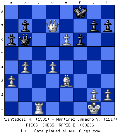 Last move : 1-0 2020 March 29 15:50:37 [Event "FICGS__CHESS__RAPID_E__000236"] [Site "FICGS"] [Date "2020.02.20"] [Round "1"] [White "Piantadosi,Angelo"] [Black "Martinez Camacho,Victor Hugo"] [Result "1-0"] [WhiteElo "1391"] [BlackElo "1217"] 1.e4 c6 2.d4 d5 3.exd5 cxd5 4.c4 Bf5 5.Bd3 Bxd3 6.Qxd3 e6 7.Nc3 Bb4 8.a3 Ba5 9.b4 Bc7 10.Nf3 Nf6 11.O-O O-O 12.Ne5 Nbd7 13.f4 Rc8 14.cxd5 Nxd5 15.Nxd5 exd5 16.Qb5 Nxe5 17.fxe5 Bb6 18.Bf4 a6 19.Qd3 Rc4 20.Be3 Qc7 21.Rac1 Rc8 22.Rxc4 Qd7 23.Rxc8+ Bd8 24.Rxd8+ Qxd8 25.Qf5 Qc7 26.e6 f6 27.Qxd5 Kf8 28.Rc1 Qb6 29.Qd7 1-0 Caro-Kann : Panov-Botvinnik attack Kingside Castling by player White (move 11) Kingside Castling by player Black (move 11) Player White won this chess game. Follow this game move after move (download)No price is too great for the scalp of the enemy King. (Koblentz) Fallen sollten polizeilich verboten werden. (Savielly Grigorievitsch Tartakower) El Ajedrez es un mar en el cual un mosquito puede beber y un elefante puede bañarse. (Refrán Hindú) Le jeu d'échecs fait naître et fortifie en nous plusieurs qualités précieuses dans le cours de l'existence, telles que la prévoyance, la circonspection, la prudence, et la persévérance. (Benjamin Franklin - 1783, la morale des échecs) Perhaps chess is the wrong game for the times (The Chess Master and the Computer, by Garry Kasparov - 2010)