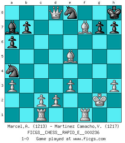 Last move : 1-0 2020 March 16 14:14:51 [Event "FICGS__CHESS__RAPID_E__000236"] [Site "FICGS"] [Date "2020.02.20"] [Round "1"] [White "Marcel,Alexis"] [Black "Martinez Camacho,Victor Hugo"] [Result "1-0"] [WhiteElo "1213"] [BlackElo "1217"] 1.f4 d5 2.Nf3 Nf6 3.e3 Bg4 4.Be2 e6 5.O-O Bc5 6.b3 O-O 7.Bb2 Nbd7 8.Nc3 a6 9.a3 Rc8 10.b4 Ba7 11.h3 Bxf3 12.Bxf3 c5 13.bxc5 Nxc5 14.Rc1 Re8 15.Qe2 e5 16.fxe5 Rxe5 17.Na4 Nxa4 18.Bxe5 Rc6 19.Qd3 Ne8 20.Bxd5 Rg6 21.Bxf7+ Kh8 22.Qxd8 Rxg2+ 23.Kxg2 1-0 Bird's Opening Kingside Castling by player White (move 5) Kingside Castling by player Black (move 6) Player White won this chess game. Follow this game move after move (download)Life is like a game of Chess, changing with each move. (Chinese proverb) Heutzutage gewinnt im Turnier nicht derjenige Spieler, der weitreichende Pläne entwirft, sondern einfach jener, der Zug um Zug kämpft. (David Bronstein) Fischer es el jugador mas fuerte del mundo. De hecho, el jugador mas fuerte que jamas haya existido. (Larry Evans) Vous m'avez demandé de vous exposer quel est le fondement de la prière. Je ne fais que préparer les pièces du jeu sur la table... Nous sera-t-il permis d'en adopter les règles et si nous les appliquons scrupuleusement nous ne tarderons pas à faire mat le Roi divin ! Il ne pourra échapper à nos mains. (Sainte Thérèse d'Avila, Chemin de perfection) 'preceded by its own quotation yields a falsehood' preceded by its own quotation yields a falsehood. (W. V. O. Quine - Set Theory And Its Logic, 1953)